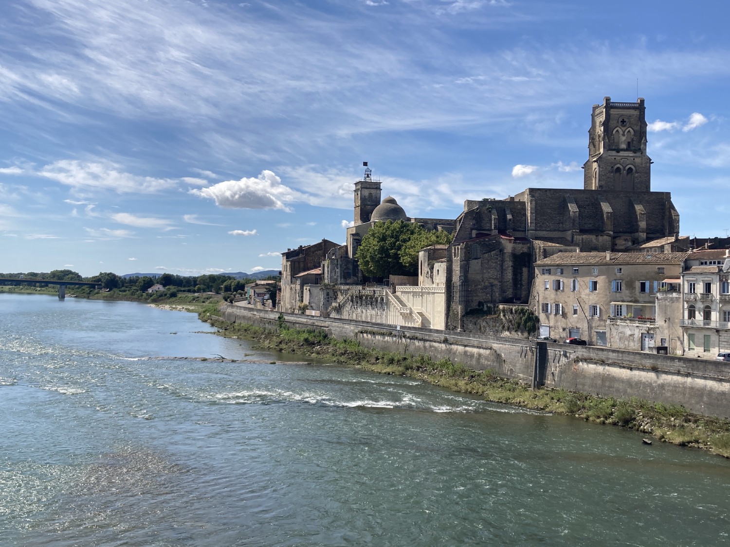 Vue de l’Eglise Saint-Saturnin et du prieuré Saint-Pierre depuis le Pont Saint-Esprit, sur le Rhône.