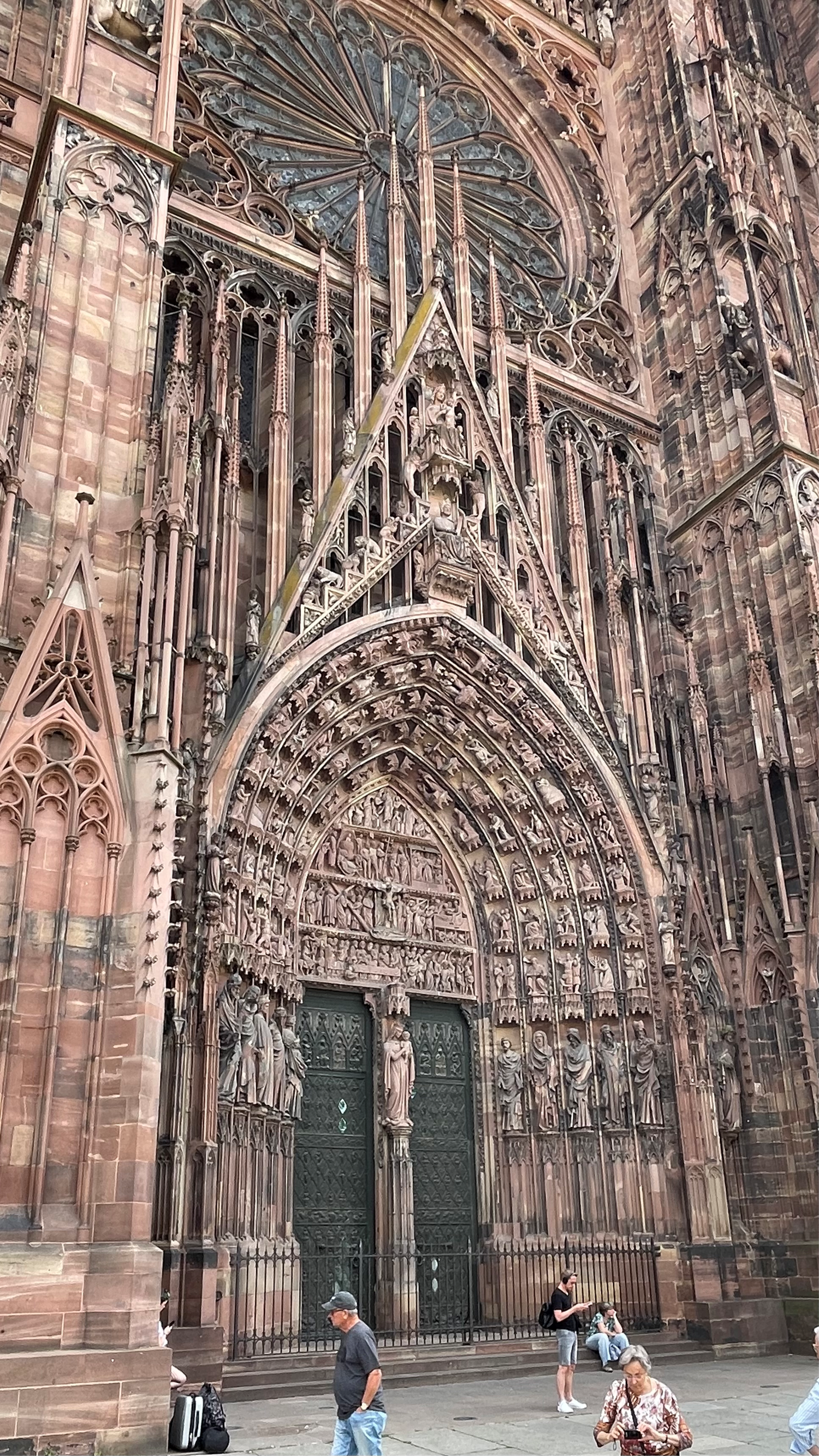 Strasbourg ( Bas-Rhin ) . Le tympan du portail principal, à l’Ouest de la cathédrale , est entouré de statues de prophètes et de martyrs, et a pour thème la Passion du Christ. Des scènes de l’Ancien et du Nouveau Testament sont représentées sur les voussures.