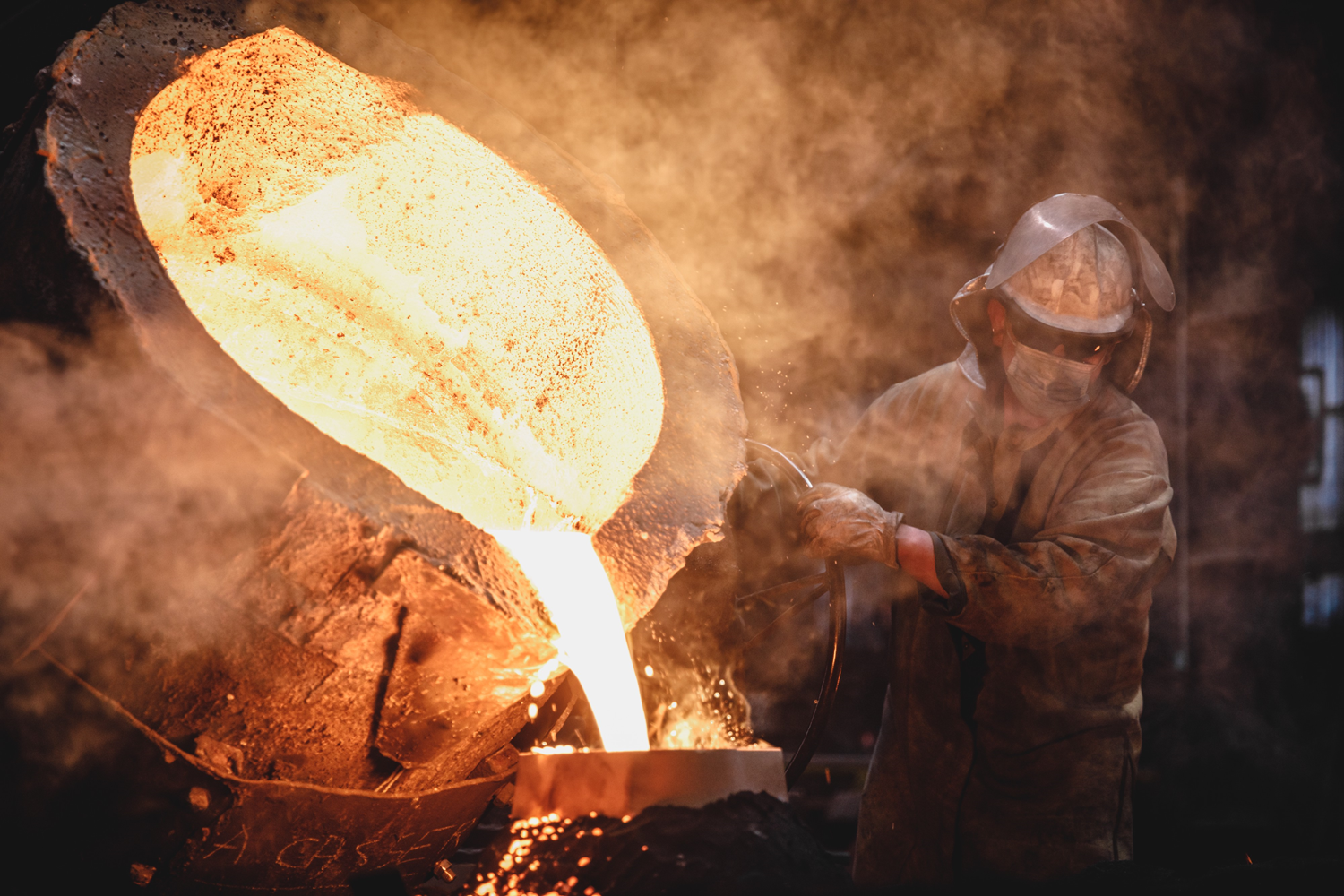 The moment of molten metal pouring is always critical. Even though the gestures have hardly changed since the GHM factory's opening in 1857, it takes years of experience to pass this phase. The heat of the incandescent mass can reach 2,553° F (1,400°C), and the workers handling the pouring wheel seem little protected. The factory is renowned worldwide for the high quality and flowability of its cast iron. The statues, fountains, or pieces of street furniture crafted at GHM adorn numerous cities throughout the globe.