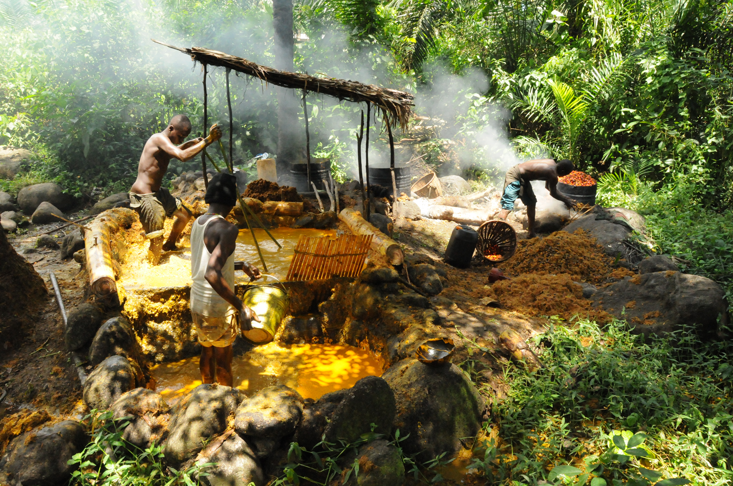 In south west of Cameroon there are some wild palm tree that people use directly on the field to produce palm oil.