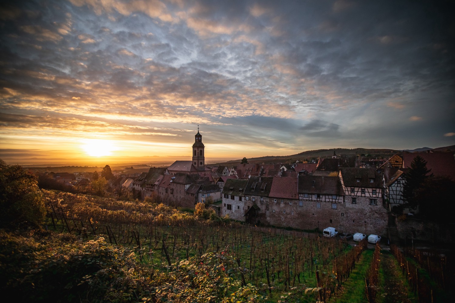 Riquewihr is part of the Colmar-Ribeauvillé district. It stands in the heart of the vineyard, along the wine route in the Piedmont of the Vosges. Vines were already growing there in the 8th century. The city sits a the entrance of a valley bordered by a diverse forest to the west. The Schoenenbourg hill (650 ft / 198 m) is home to the vineyards to the north and slightly dominates the plains to the east and south-east. From a geological point of view, the Vosges' piedmont is composed of voltzia sandstone and marls.