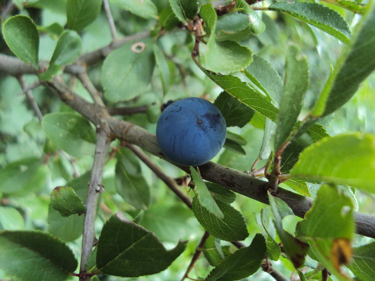 La prunelle, fruit du prunellier sauvage, se récolte après les premières gelées, blette, et peut alors être consommée.