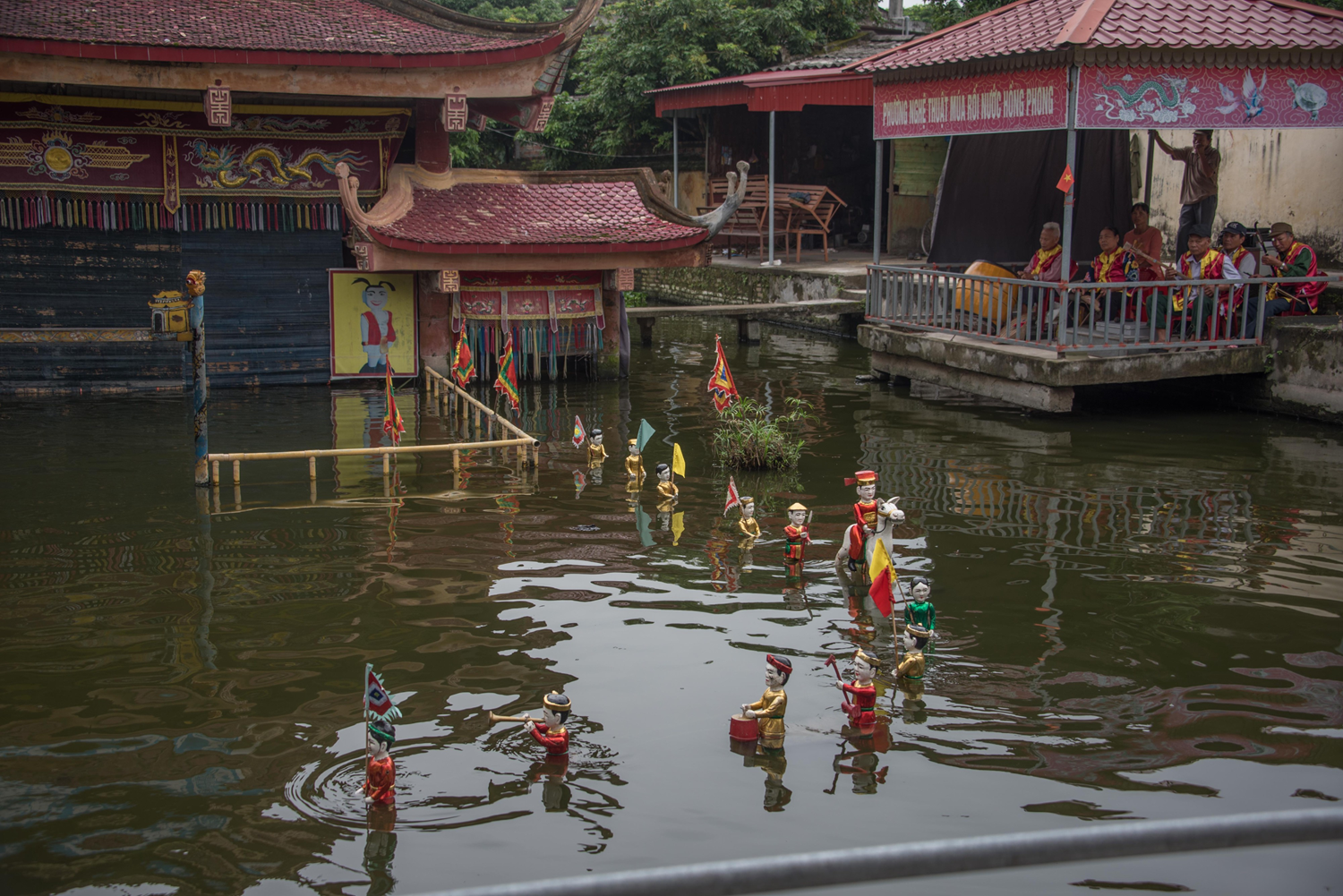 Marionnettes sur eau est un théâtre vietnamien traditionnel accompagné de musique où l'action et la manipulation ont lieu sur et dans un bassin.
