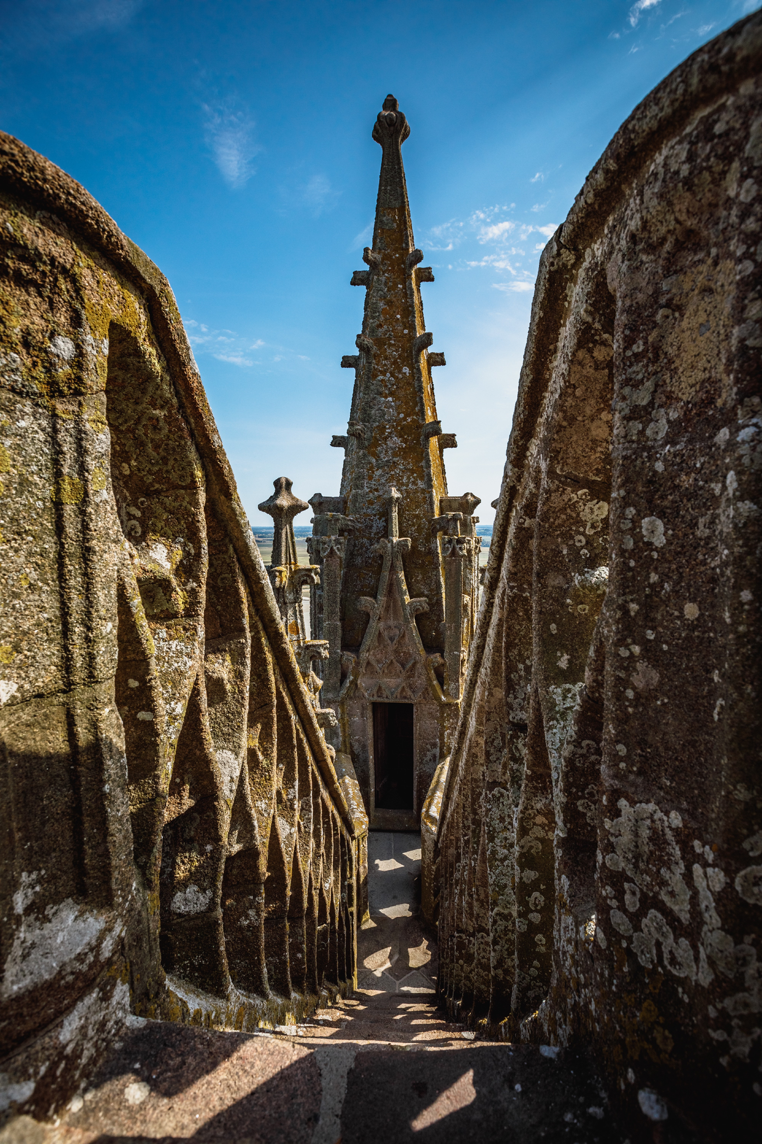 At the foot of the buttresses that support the choir of the abbey church, the view is impressive. Below, the village and the tourists seem tiny. Above, pinnacles on which gulls nest, Gothic sculptures and gargoyles. The luckiest visitors will be able to take the lace staircase, a unique passageway built over a flying buttress, to reach the abbey’s bell tower. Its finely carved granite banisters are in the pure radiant Gothic style. At 110 metres high above the shore, it is a bit like daring to be on a par with the angels.