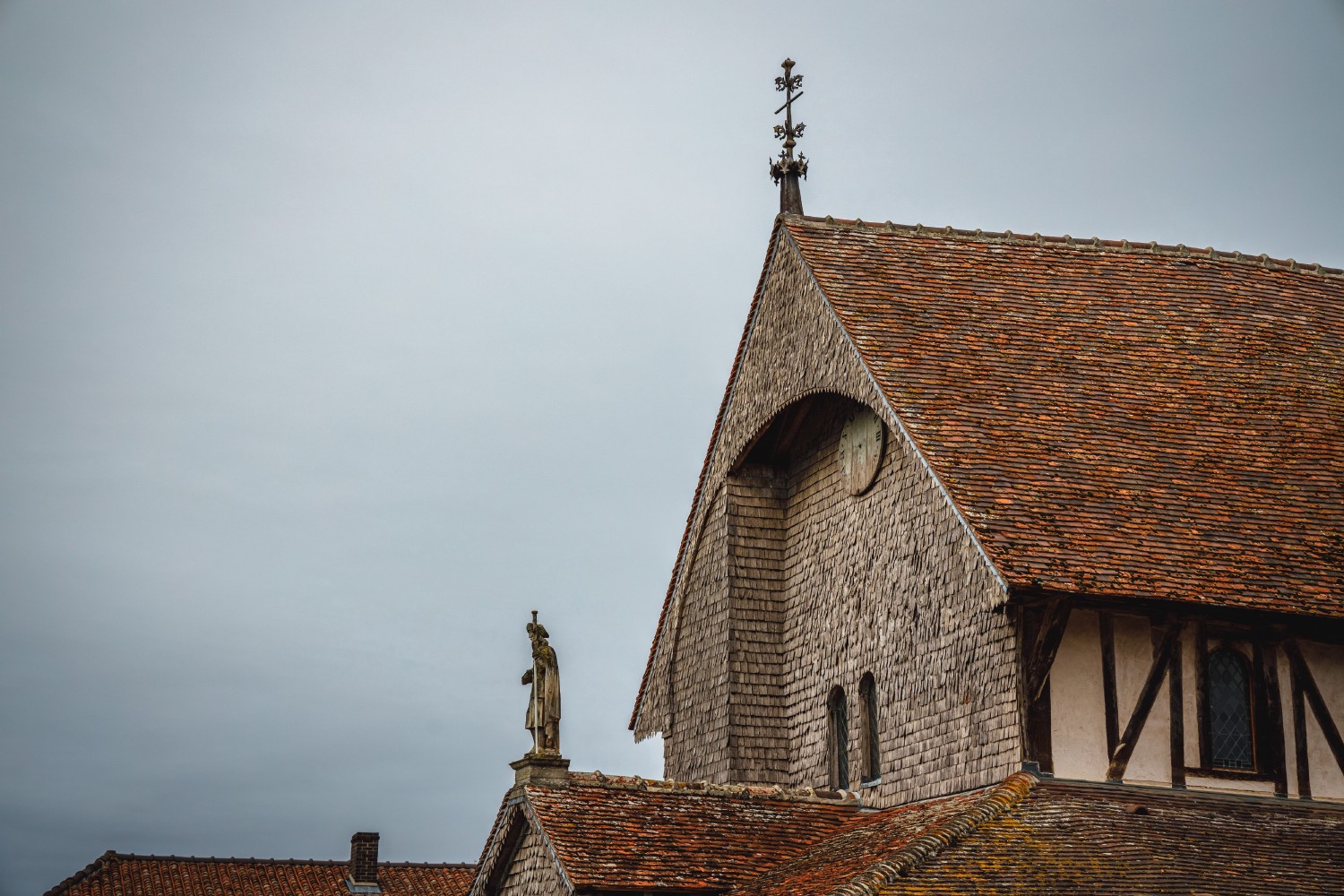 The Saint-Jacques-et-Saint-Philippe (St. James and St. Philip) church in Lentilles, in the Aube, is built in the half-timbered style of Champagne houses. Built in the early 16th century, it was restored in the 1970s due to the deterioration of its wooden tile covering. At the end of the 19th century, the original stained glass windows were replaced by decorative compositions. The preserved elements representing donors or saints have been grouped in the oculi (round apertures) of the choir. These stained glass windows are the work of the master glassworkers of Troyes.