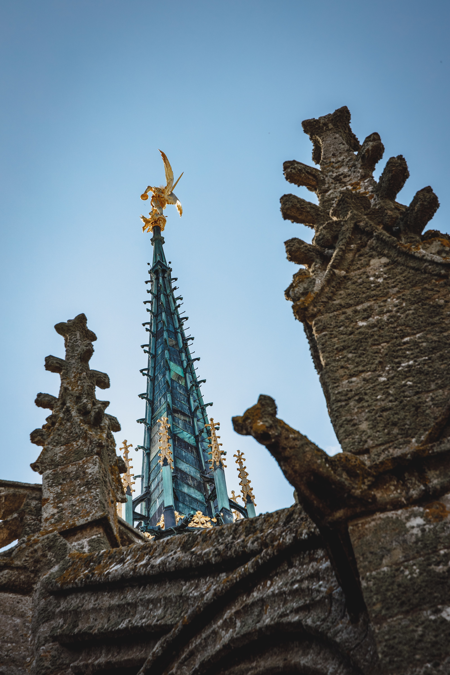 The spire of the abbey church is topped by a statue of the archangel Saint Michael striking down Satan, represented by a dragon at his feet. It is a statue of about 4.5 metres high, made of welded copper plates, mounted on a form and then gilded. Also serving as a lightning rod, the statue was severely damaged by a violent storm in 1982. Removed with the help of a helicopter, the statue was restored, re-gilded, and returned to the top of the spire, first in 1987 and then again in 2016.