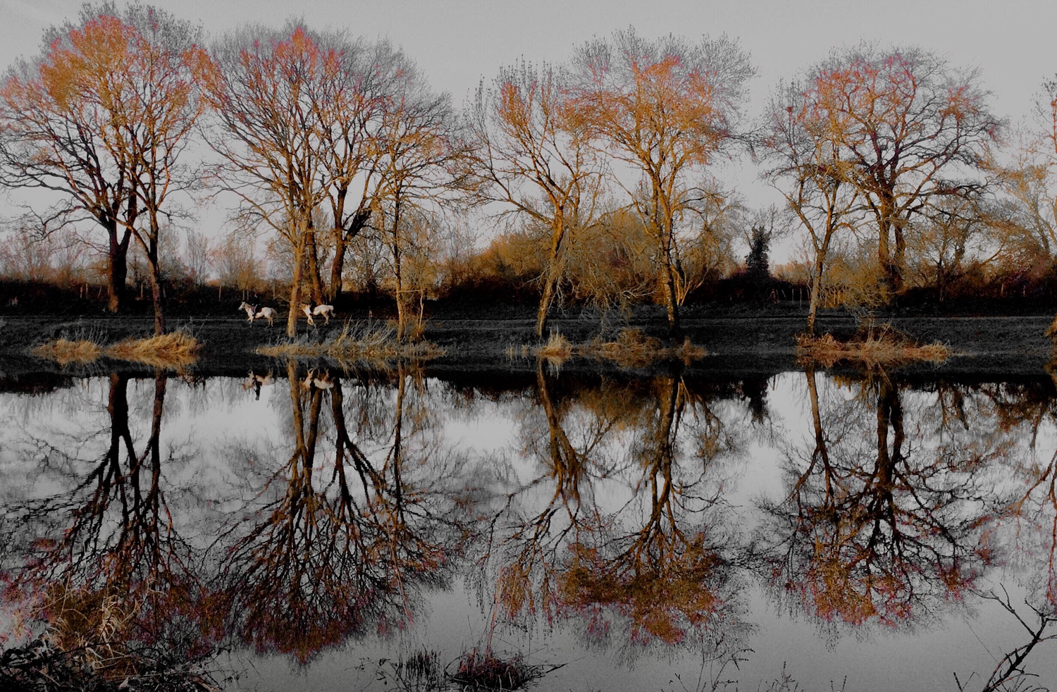 Balade en vélo au canal de la martinière . Reflets magnifiques. 2 cavaliers sur l autre rive . C est la pause . Je shoote ! Moment magique.