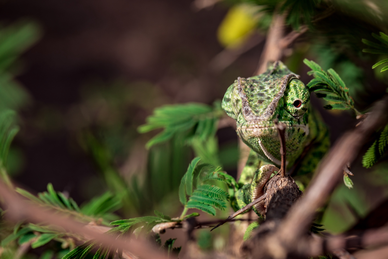 One of the few times that a flap-neck chameleon may be seen on the ground is when it looks for mates or when a female is about to lay its eggs. After about trois months gestation, the female dig a nest in damp soil, to lay between 20 or 40 eggs, sometimes up to 60 eggs. Depending on environmental conditions, the eggs can take more than one year to hatch.