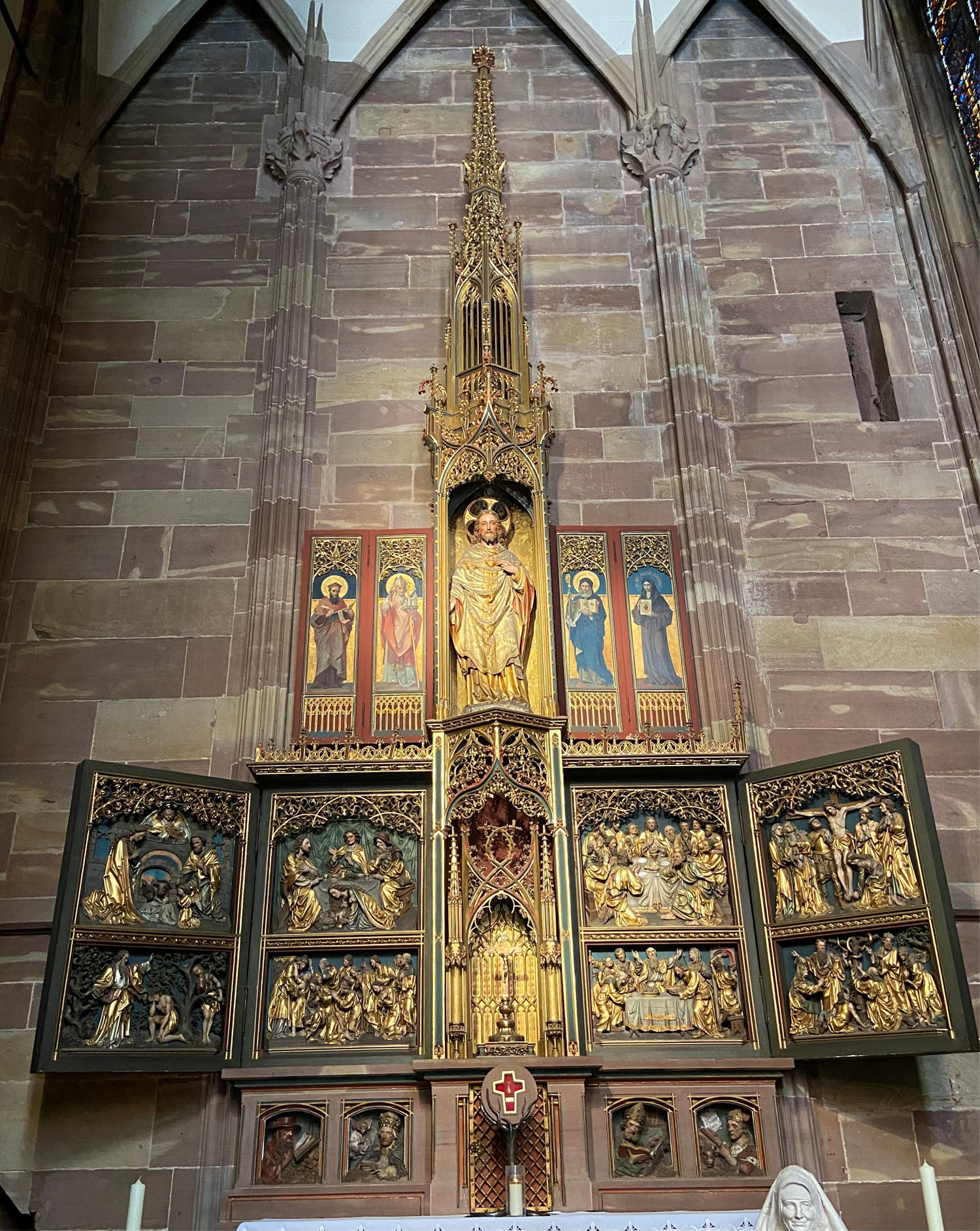 Dans la chapelle Sainte Catherine de la cathédrale de Strasbourg, se trouve, sur l’autel du Sacré Cœur, un retable réalisé au 19ème siècle.