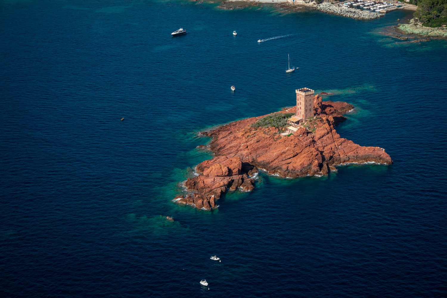 Si le massif de l'Estérel est associé à la couleur rouge de ses roches rhyolitiques riches en hématite semblables à leurs homologues de l'île d'Or, on y trouve aussi, de façon plus confidentielle, du porphyre bleu de l'Estérel aussi appelé estérellite. La roche, à refroidissement lent, est une microdiorite quartzeuse qui n'affleure que dans la partie méridionale du massif, à savoir dans la région d'Agay et de Cap Dramont où s'étend l'île d'Or. La plage du Dramont (arrière-plan) est, par exemple, constituée de galets d'estérellite.