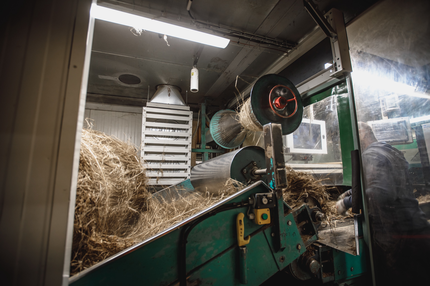 Soon after harvest, the flax straws arrive on the scutching line. The bales are unrolled, and the straw is placed in homogeneous layers. Flax is crushed, beaten, and stripped of its straw and wood gangue. The remaining blond fibers are combed with ever finer combs to eliminate all the small pieces of straw left and separate the fibers between them. The scutching inaugurates a long process resulting in golden ribbons thin as hair which make the reputation of Normandy.