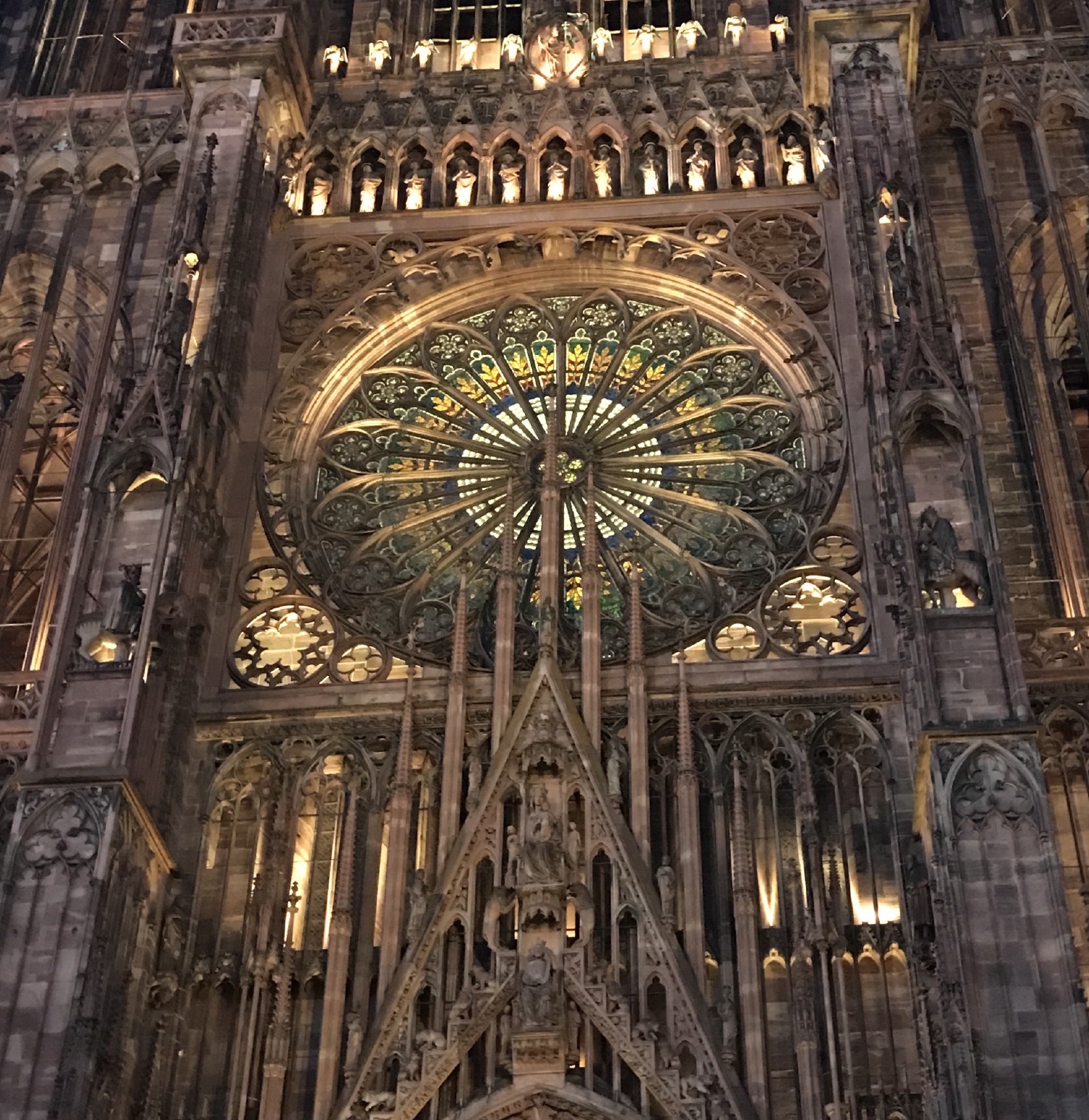 Vue extérieure de la rosace, qui prend des couleurs vertes et jaunes lorsque le soleil se couche.