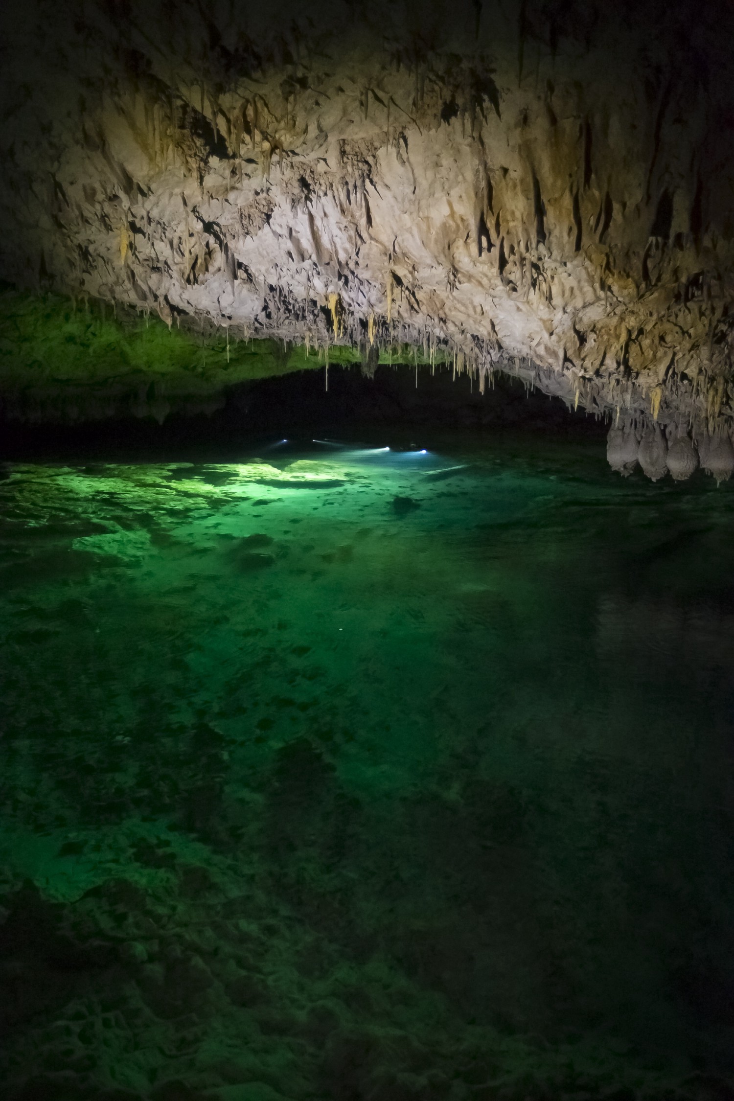 The ancient lagoon of the Makatea elevated atoll is a ruiniform coral limestone plateau. Widely eroded, dissolved by rainwater and the action of the ocean, excavated by the phosphate exploitation, it has a surface of 17.3sqmi (28km2) where caves, tunnels and cavities abund. The feo of the ancient deposits returning the solar energy stored during the day, the underwater explorations avoid the stifling atmosphere of aerial cavities.