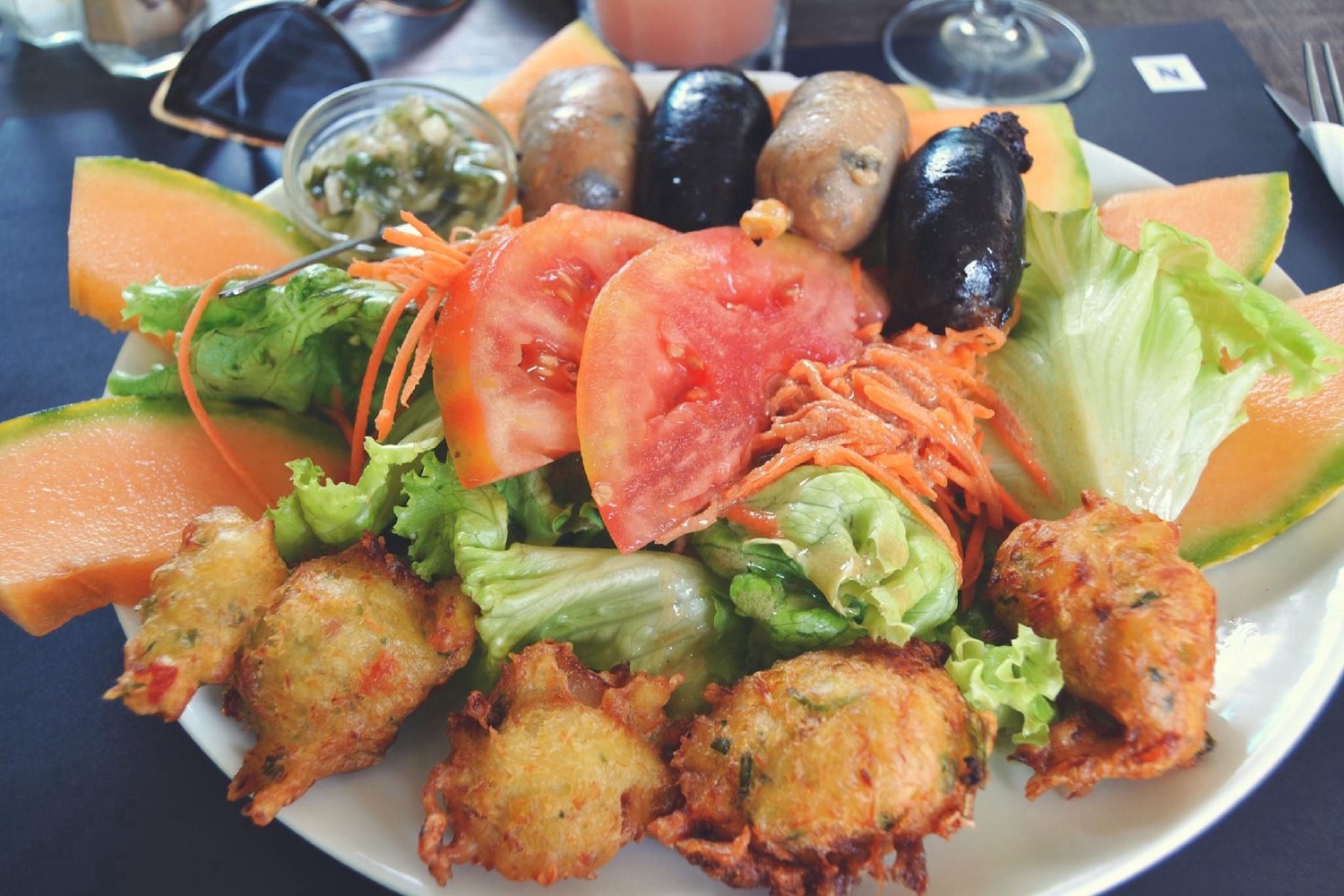 Premier repas dans un petit bar/restaurant à côté de la plage du marché de Saint-Anne lors de notre premier jour en Guadeloupe. Étant une grande fan d’accras de morue et de boudin noir, je ne pouvais me laisser tenter que par une salade créole. Des saveurs épicées garanties mélangées à un peu de fraîcheur !