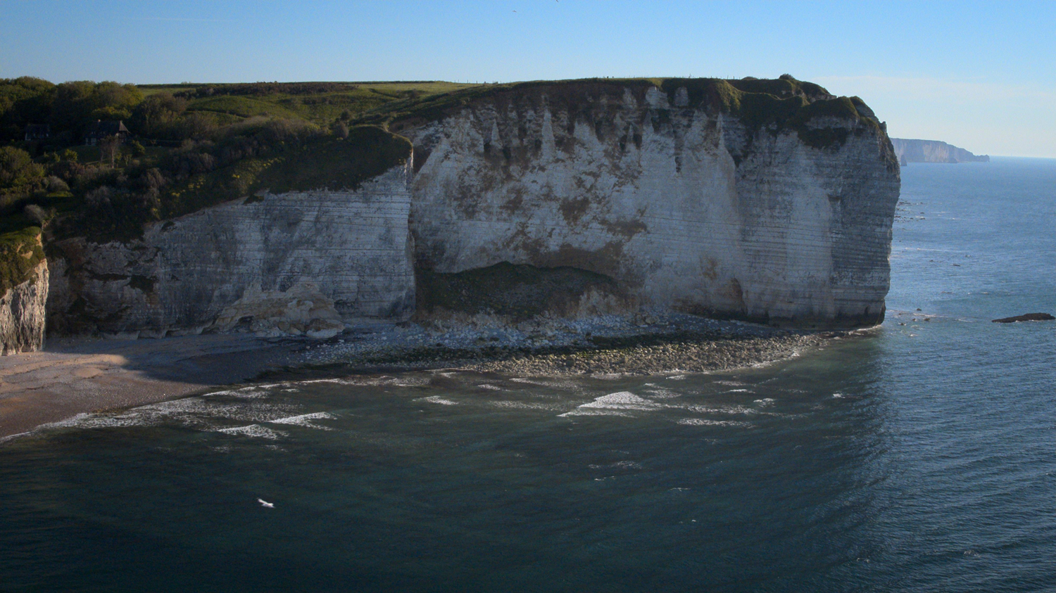 The beach of Vaucottes sees its cliff, known as the Roche aux Anglais, advancing into the English Channel on the Côte d'Albâtre (Alabaster Coast). Plateaus, valleys, and valleuses constitute the three faces of the coast. In Vaucottes, it widens and discovers a pebble beach even more apparent at low tide and ideal for shellfishing (whelks, mussels). The cliff or Nez de Vaucottes (Vaucotte Nose) sees its sedimentary chalk and flint layers eroding with the rainwater and the currents boring into it at its base.
