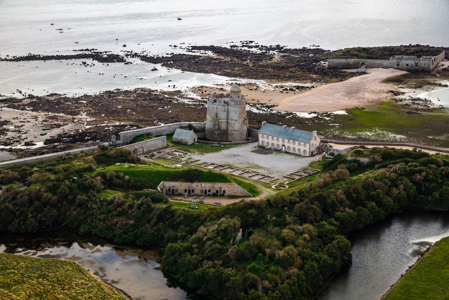 Some 1,7 miles (2.75 km) from the Fort de la Hougue, the Fort de Tatihou secures the pass that leads to the port of Saint-Vaast-la-Hougue over 69 acres (28 ha). Completed in 1699, its Vauban tower also has an adjoining turret whose spiral staircase, with a semi-spherical dome, serves the three floors. The fort also houses barracks, stores, a vast powder magazine covered with earth, and a chapel from 1714 dedicated to Saint Clement, the patron saint of sailors.