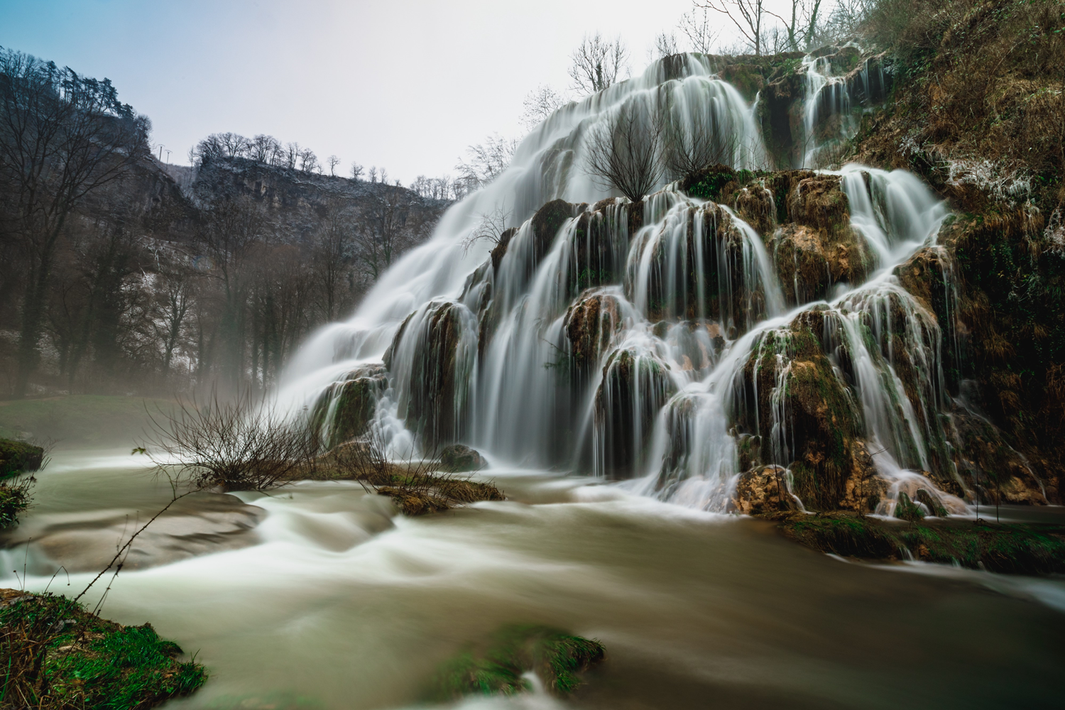 When the water from the Cuisance river emerges from the limestone rocks at the bottom of the Arbois blind valley, it abruptly loses the carbon dioxide it has taken on while circulating in the groundwater. It then forms by precipitation a sedimentary rock called tuff or travertine which gives rise to all forms of concretions, like the Tufs waterfall of Planches-près-Arbois. These sediments generally trap plant debris, the imprint of which is preserved in the rock.