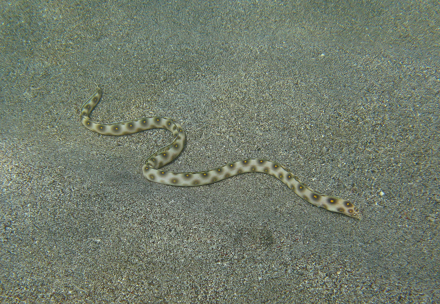 Contrairement aux apparences, ces animaux sont bien des poissons (proches des murènes), et pas des serpents . Ce genre de poisson n'est pas venimeux.
