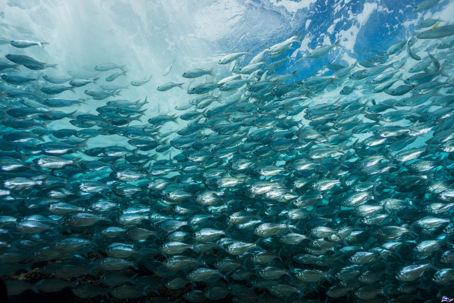 Shoal of Bigeyes travelly (Caranx sexfasciatus) in Polynesian waters