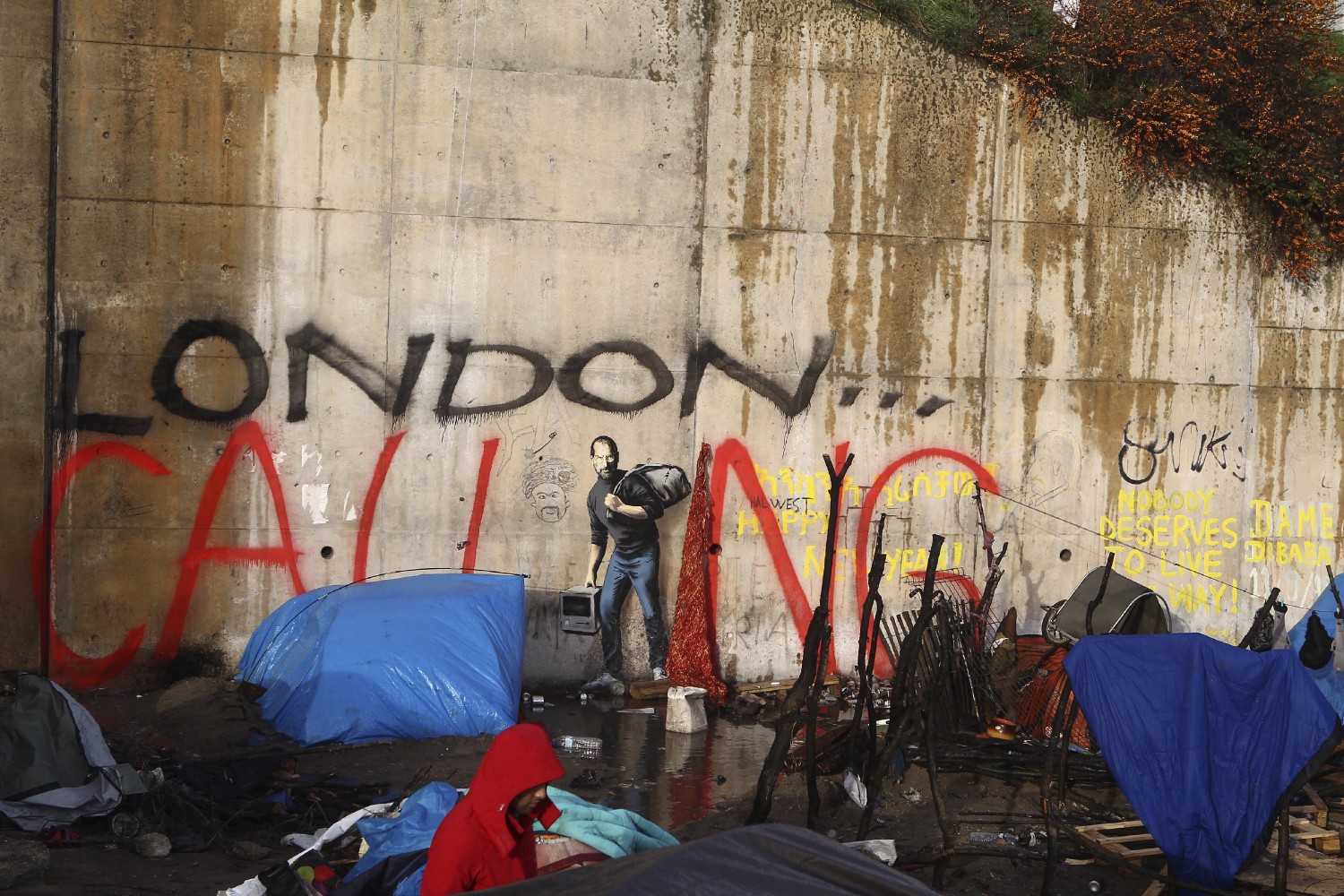 A painting by English graffiti artist Banksy is seen at the entrance of the Calais refugee camp in France, in Calais, northern France, Monday, Dec. 21, 2015. The elusive graffiti artist has depicted the late Apple guru Steve Jobs — whose biological father was from Syria — carrying a black garbage bag and an early model of the Macintosh computer. (Photo/Michel Spingler)