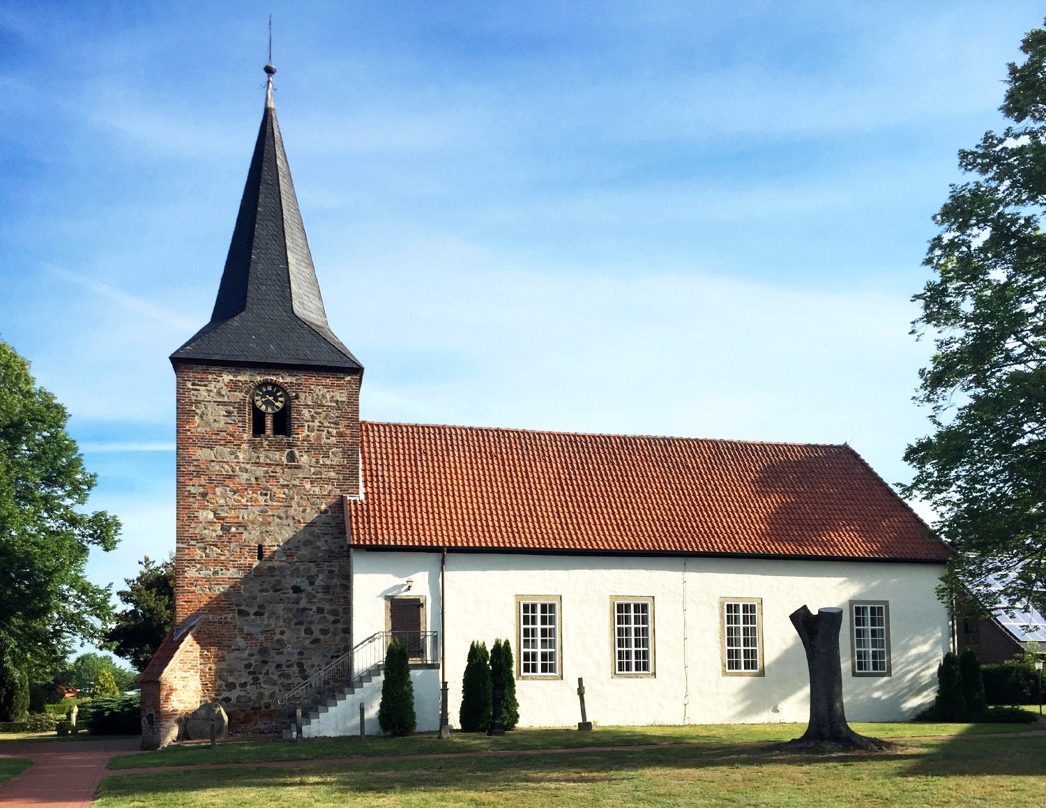 Die St. Georgs-Kirche in Warmsen wurde 1226 erstmals urkundlich erwähnt. Sie entstand als Feldsteinbau und wurde 1737 durch Fachwerkanbauten erweitert. Durch diesen Umbau erhielt die Kirche ihren t-förmigen Grundriss, womit auch der Umzug des Altars vom allgemein üblichen Platz im Chor an der Ostseite in die Mitte der südlichen Längsseite des Kirchenschiffes verbunden war.