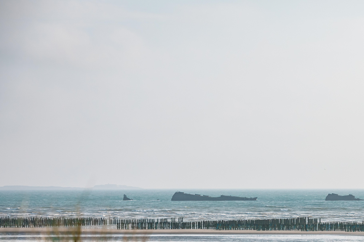 This photo shows the vertical bouchots (stakes) used for mussel farming at Utah Beach in the Manche department. These vertical bouchots, which are uncovered at low tide, protrude from the ground by about 6.5 ft (2 m). They are implanted in lines of 328 ft (100 m) spaced 11.4 ft (3,50 m). These lines have two hundred simple piles or two hundred and fifty double piles. In the Utah Beach sector, vertical bouchots have replaced table-top mussel farms with higher yields but whose harvesting cannot be mechanized and that are less resistant to the sea.