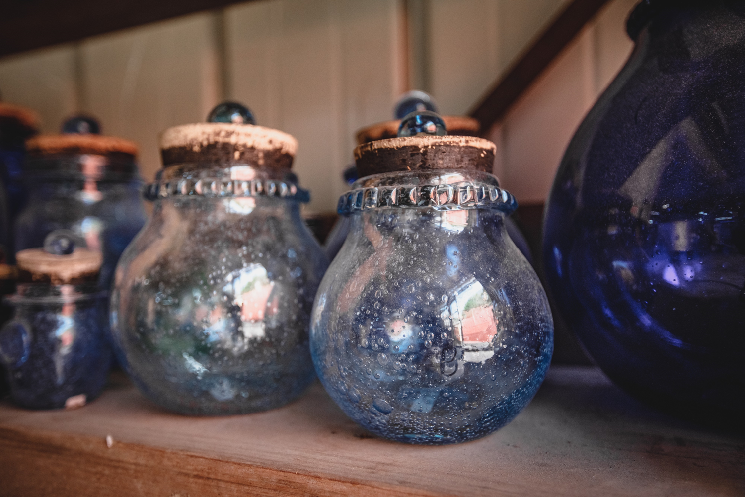 Cork oak forestry and art glassmaking - two emblematic activities of the Mediterranean region - are highlighted in this photo of decorative jars in bubbled glass from Biot closed with cork plugs. The cork oaks from the bark of which these corks are made grow by the thousands - mainly in mixed forests with chestnut trees - on the siliceous soils of the Var department, near Biot.