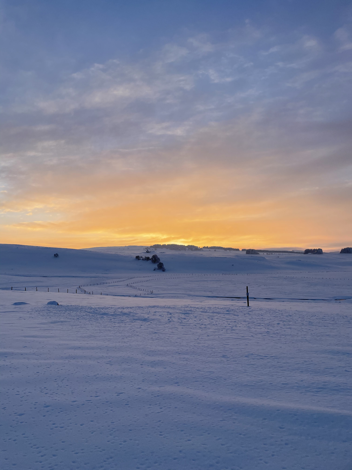 Coucher de soleil sur le lac enneigé de Saint-Andéol, en Lozère.