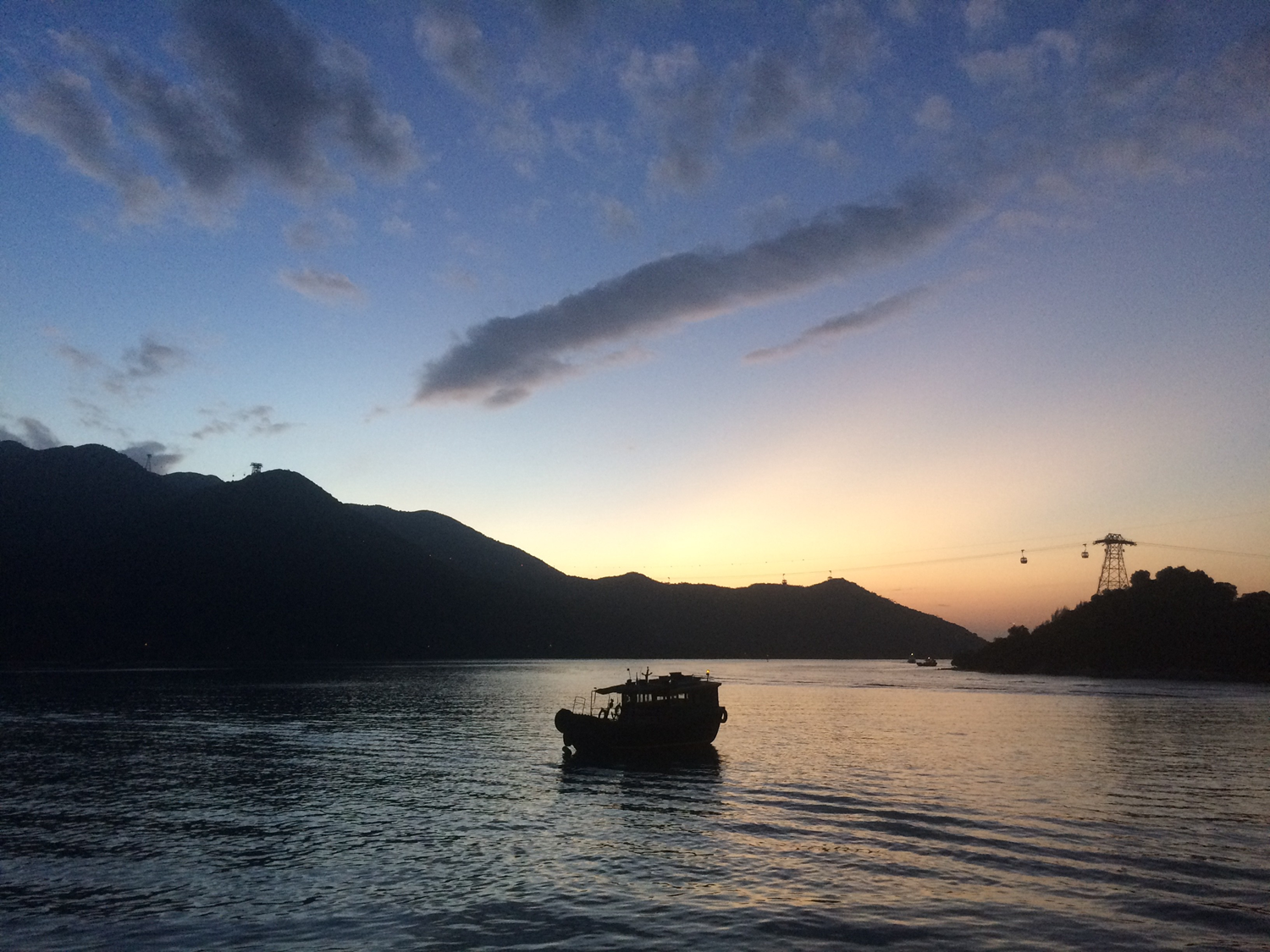 A small fishing boat forms a silhouette on the water reflections during a tropical summer sunset in Tung Chung on Lantau Island, Hong Kong.