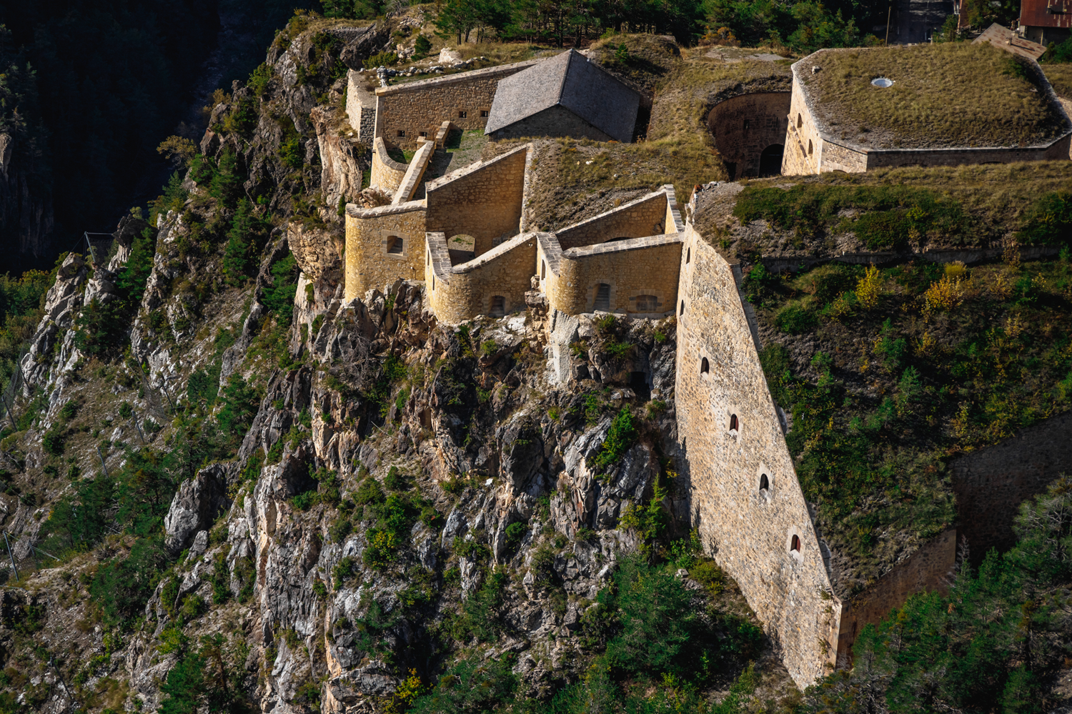 The southern side of the Infernet ridge in the Briançonnais descends towards the Cerveyrette valley, marking a flat area at Poët-Morand. There, 5,045 ft (1,538 m) above sea level, the Fort des Salettes was built between 1709 and 1712 according to Vauban's plans under the direction of the engineer Tardif. The fort, consisting of a square tower surrounded by a ditch and a counterscarp gallery with reverse fires, aimed at exposing the enemies under the crossfire of both the tower and the gallery. A Latin sentence meaning Who would dare to fight me is engraved in the stone of the redoubt.