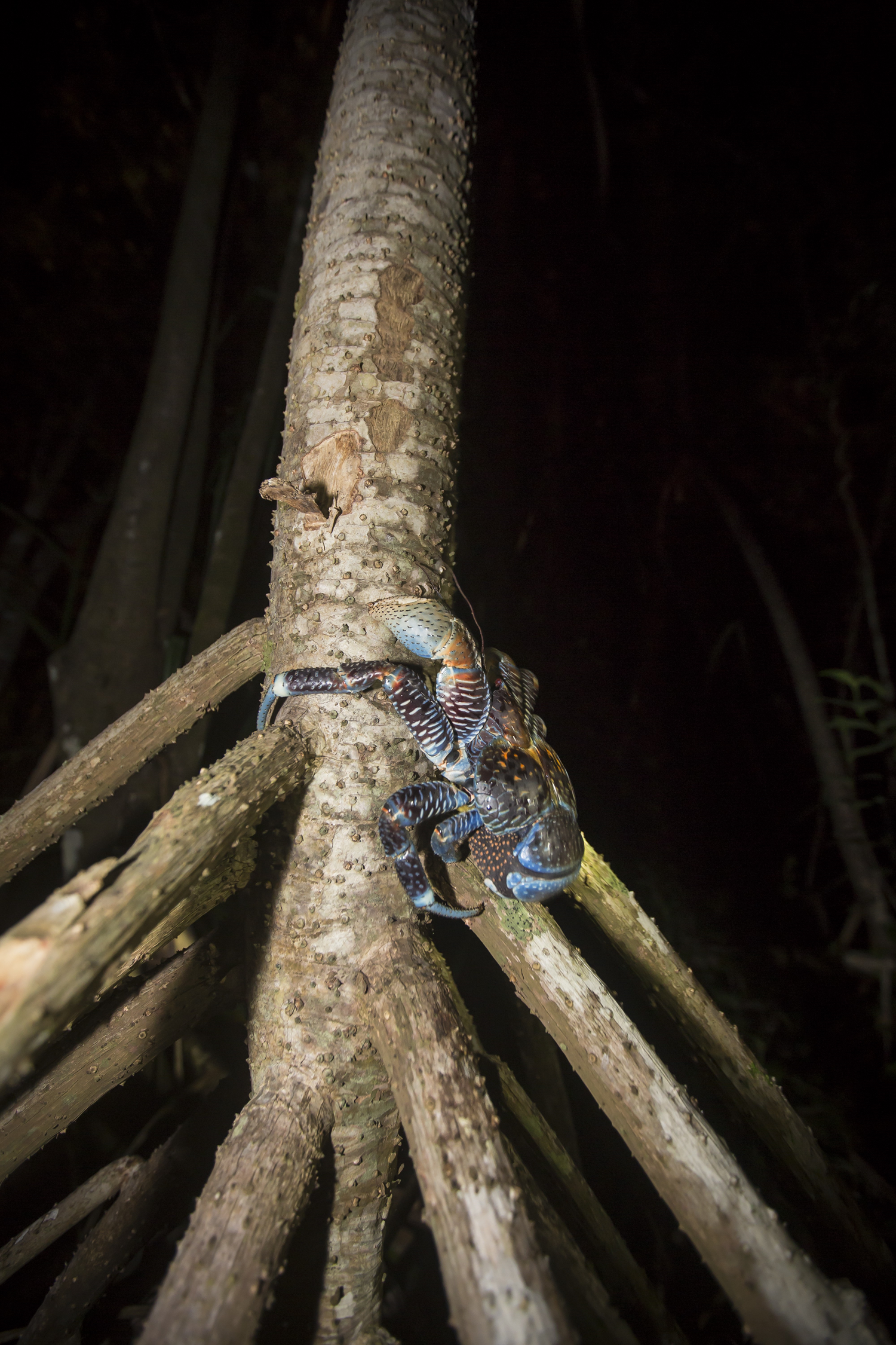 Sheltered in the coco trees, coco crabs are hunted for their flesh. Paumotus use halves of coconuts as bates.