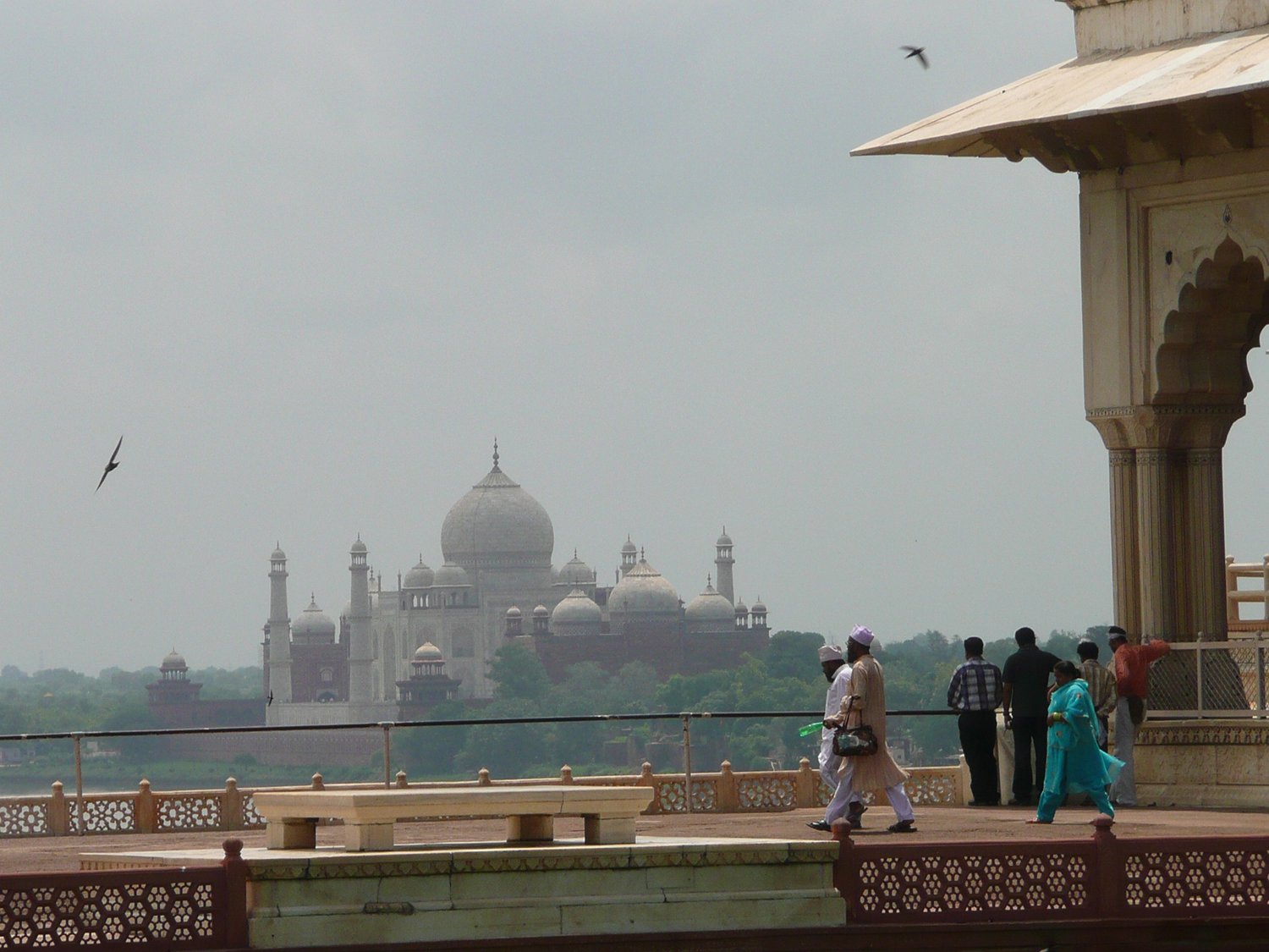 Depuis le plus grand fort de l'Inde, on voit au loin à l'Est le Taj Mahal, au-dessu de la rivière.