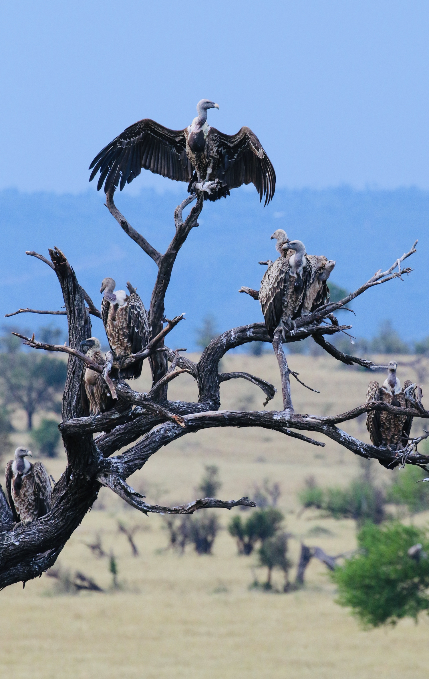 Si pour les gnous, c’est une question de rapidité et d’effort, d’autres font preuve de patience et d’opportunisme. Dans les arbres bordant la rivière, les branches sont assaillies de vautours. Ils sont là dans l’attente d’une carcasse rejetée par la rivière.