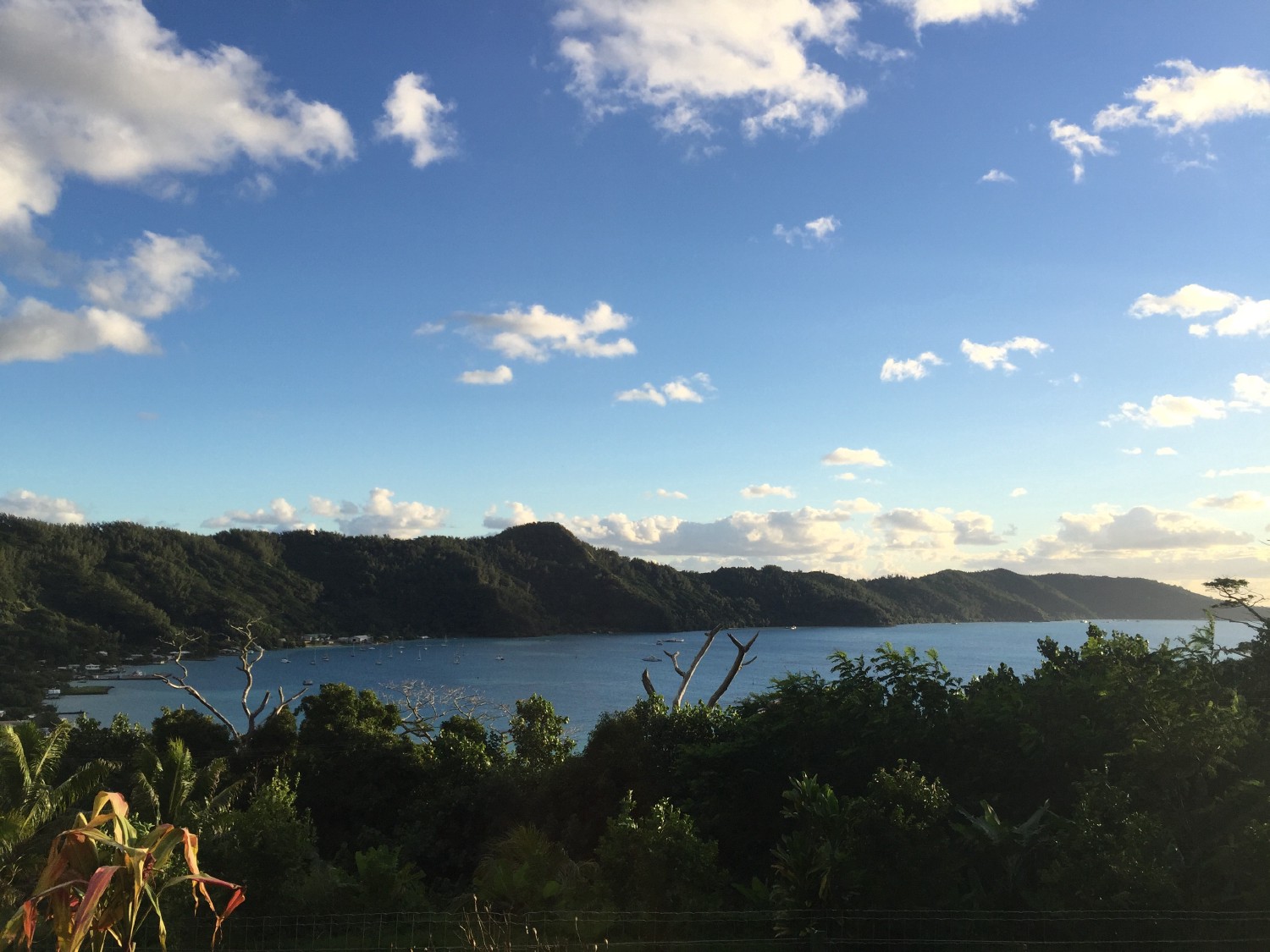 (Photographie de la baie de Rikitea, capitale de l'archipel des Gambier. Illustration d'un ciel azuré.
