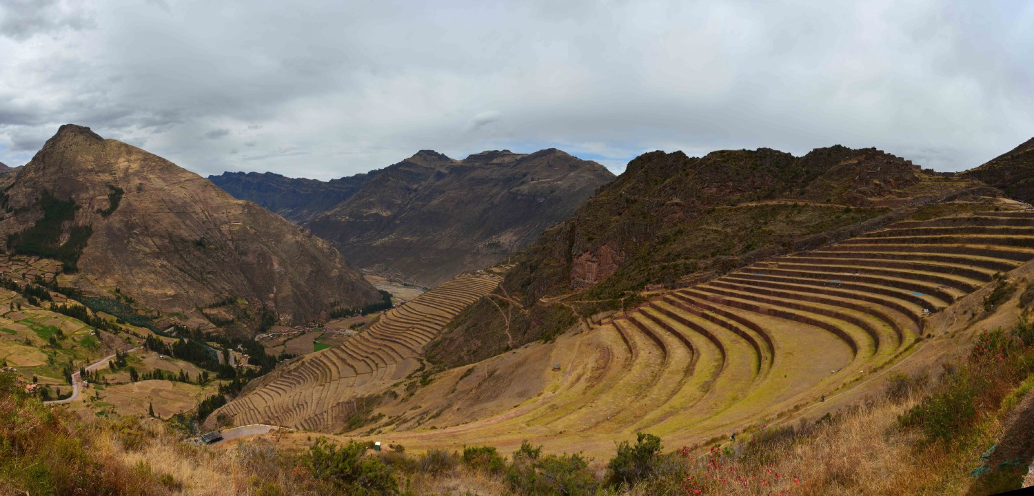 Le versant de la colline est strié de terrasses agricoles construites par les Incas et toujours utilisées, montrant comment les incas ont réussi à mettre en culture les pentes abruptes des montagnes.