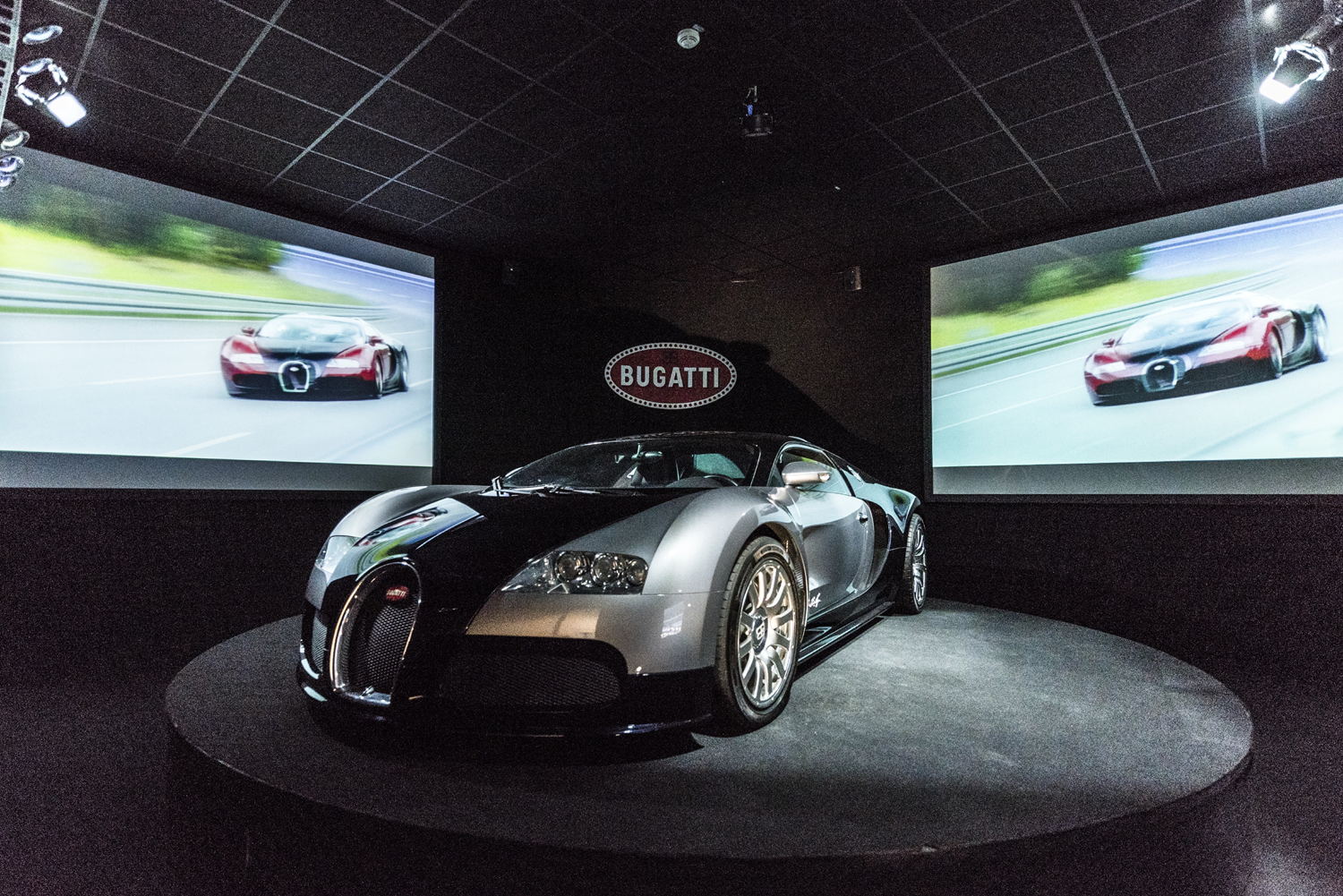 The Bugatti Veyron is one of the latest acquisitions of the Cité de l'Automobile's collection. Technical know-how inspired by aeronautics and astronautics was necessary to create its particularly efficient braking circuit. It allows going from 62 mph (100 km/h) to a standstill in 103 ft (31.4 m) and from 248 mph (400 km/h) to a complete stop in 10 seconds. The Bugatti Veyron is presented on a rotating base allowing visitors to observe every little detail. Behind the car, large screens broadcast a dynamic movie displaying its technical capabilities.