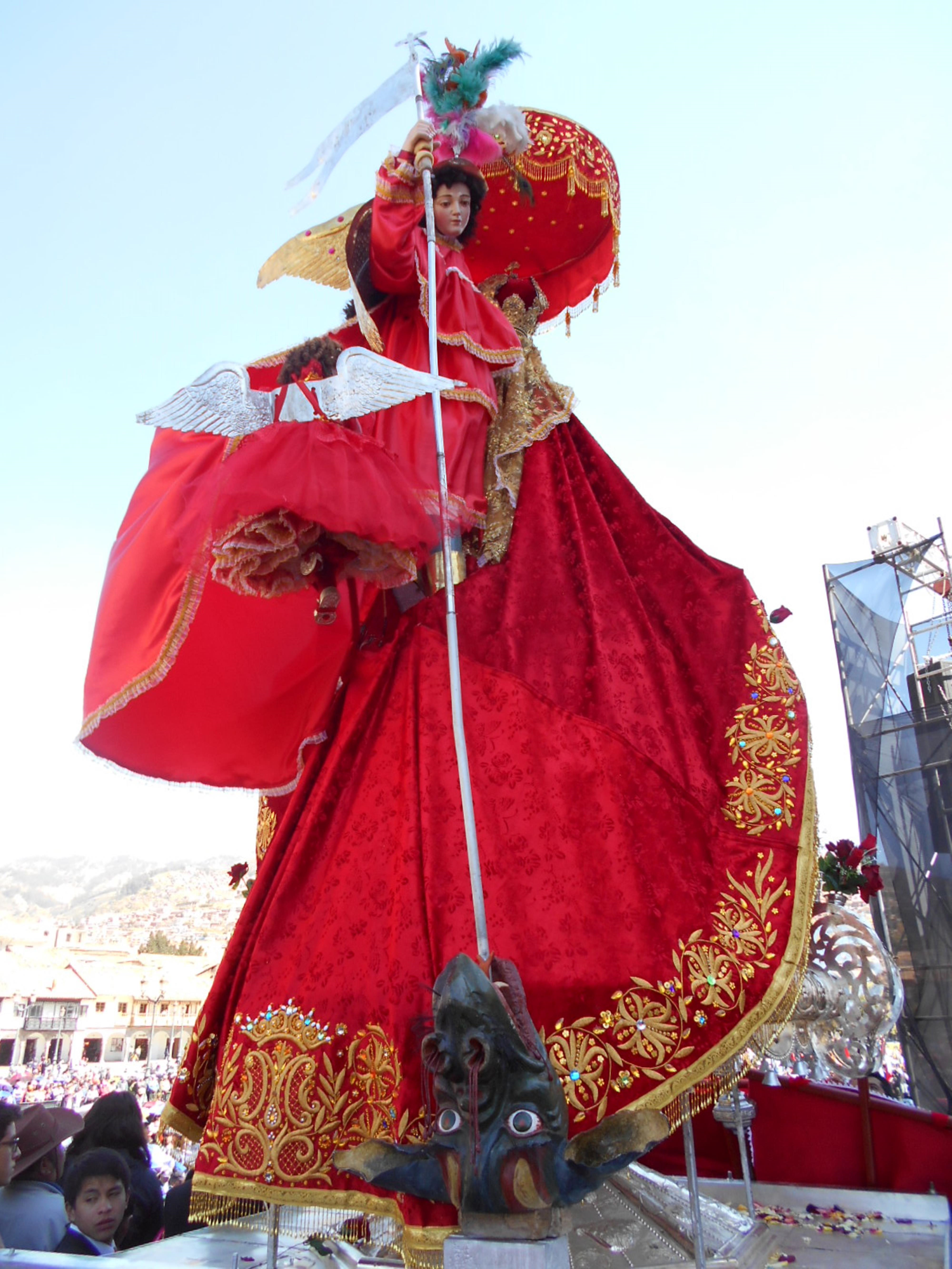 Andor of the Corpus Christi day procession. They represent images of saints and virgins. The procession runs through the main square of Cusco during the religious ceremony.
