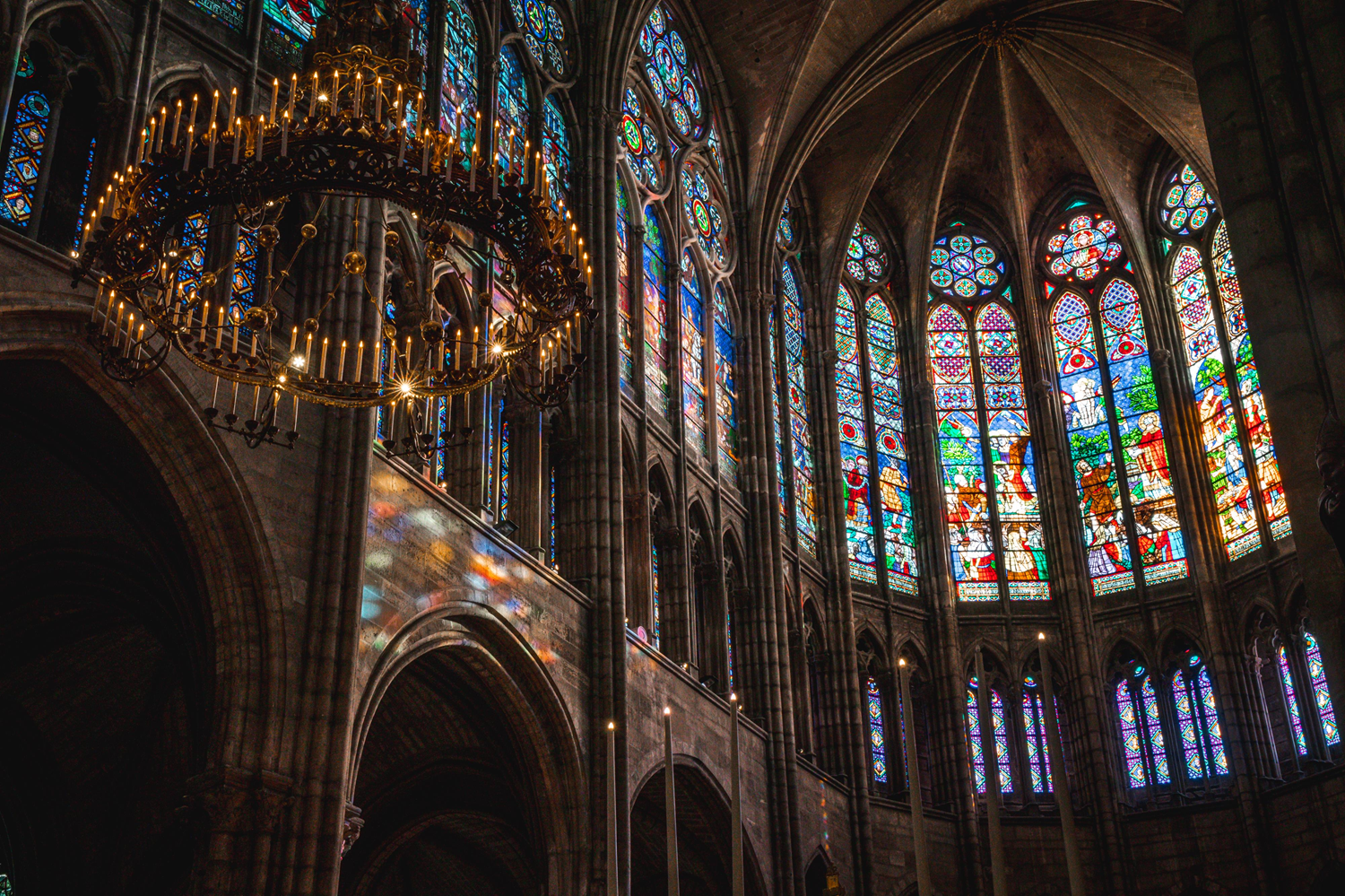 Abbot Suger (1081-1151) was the first to bring coloured stained glass windows into a religious building. Suger spent a lot of money on the fourteen stained glass windows in the choir chapels – some say more than on the stone construction. The subjects evoked by the windows were complex, especially for scholarly monks. Of the 12th-century windows, only five remain today, along with some dismantled elements. The high windows of the choir (photo) date from 1845. They depict the life of Saint Denis and episodes from the history of the basilica over the centuries.