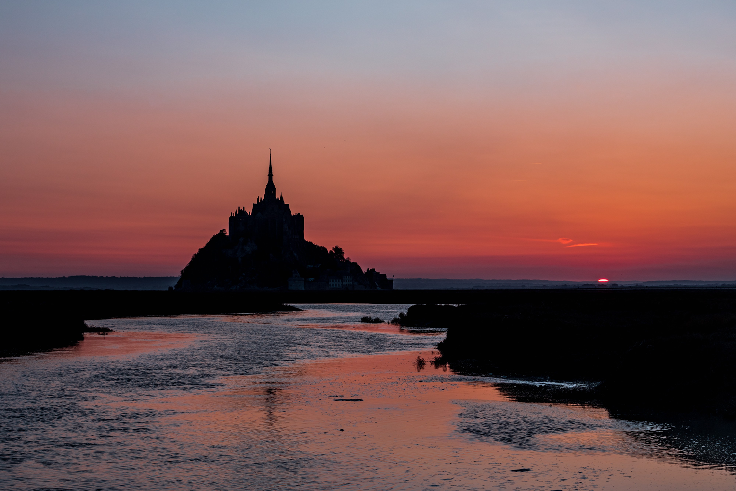 Dawn is approaching, the graceful and elegant silhouette of Mont-Saint-Michel begins to stand out against the almost incandescent sky. Its outlines of an enchanted castle will soon come to display their blackness against the sky coloured in purple, copper pink, orange yellow, red, and blue. Its mysteries are revealed to the eye of photographers and to the public that the early morning did not put off. The sight becomes sublime with the coming of the sun: the dawn lives up to all its promises.