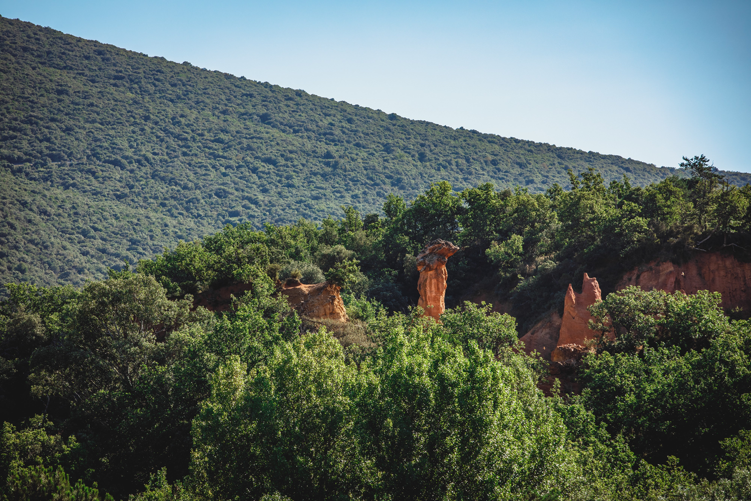 In some valleys of the Massif des Ocres, reliefs resulting from differential erosion, such as fairy chimneys, can be observed. They comprise a waterproof and resistant top cap that prevents the dissolution of the cement of the underlying sandstones. This same phenomenon of differential erosion is also visible on the sand slopes and at the foot of the cliffs on a smaller scale, sometimes with plant or mineral fragments capping small fairy chimneys.