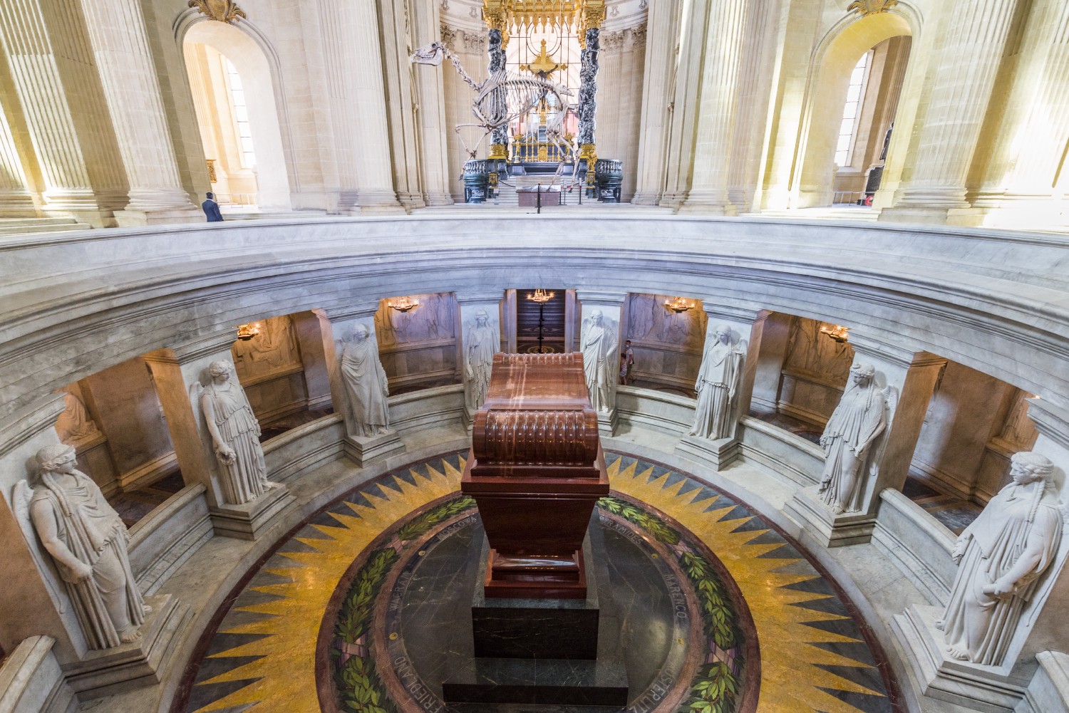 The tomb of Napoleon I is located under the Dôme des Invalides, in in the extension of the nave of the Saint-Louis des Invalides cathedral. In the 17th century, the chapel of the Dôme was reserved for King Louis XIV and his family, while the church of Saint-Louis was for the soldiers. The king and the soldiers attended the same masses, separated only by the choir of the church. A series of banners, taken from enemies over the centuries, hang under the vault. The church officially became the cathedral of the diocese of the French Armed Forces in 1986, and despite the separation of Church and State, French flags are flown around the altar.