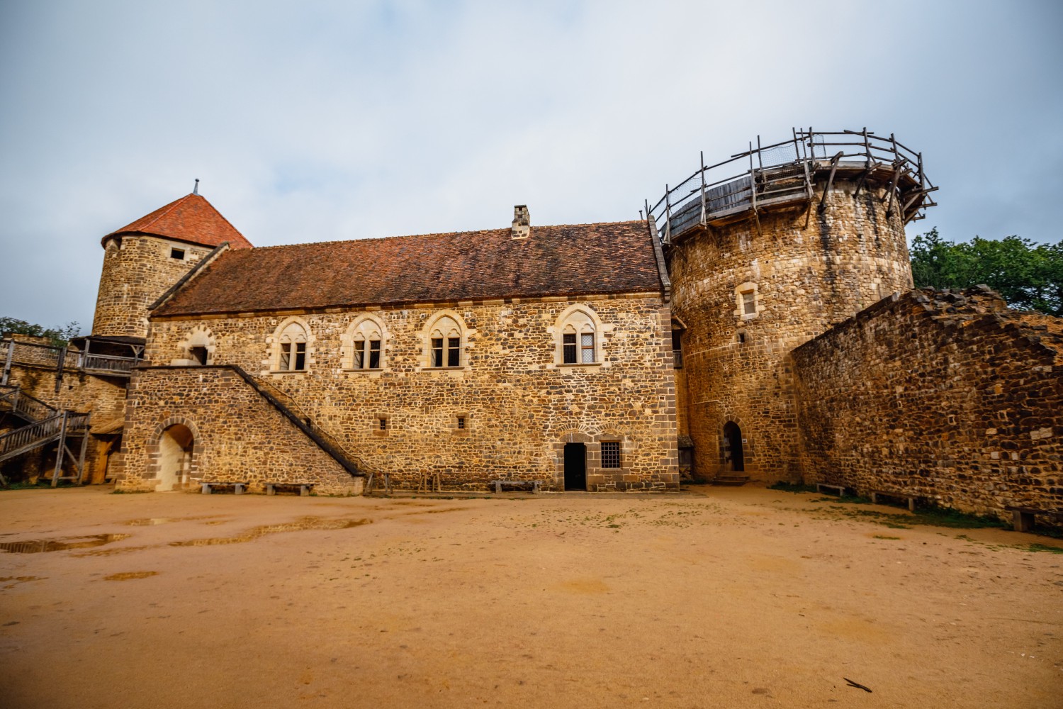 The dwelling of the Guédelon medieval castle under construction backs onto the northern curtain wall of the fortified structure and stands on two levels. The first level is a ground floor with outbuildings which notably houses a kitchen and a pantry. On the first floor, the vast reception room or aula was intended to welcome acts and parties. It was in this room that the lord dispensed justice. Its prestige is underlined by its more worked architecture with twin windows in molded and sculpted freestone that ennoble the facade.
