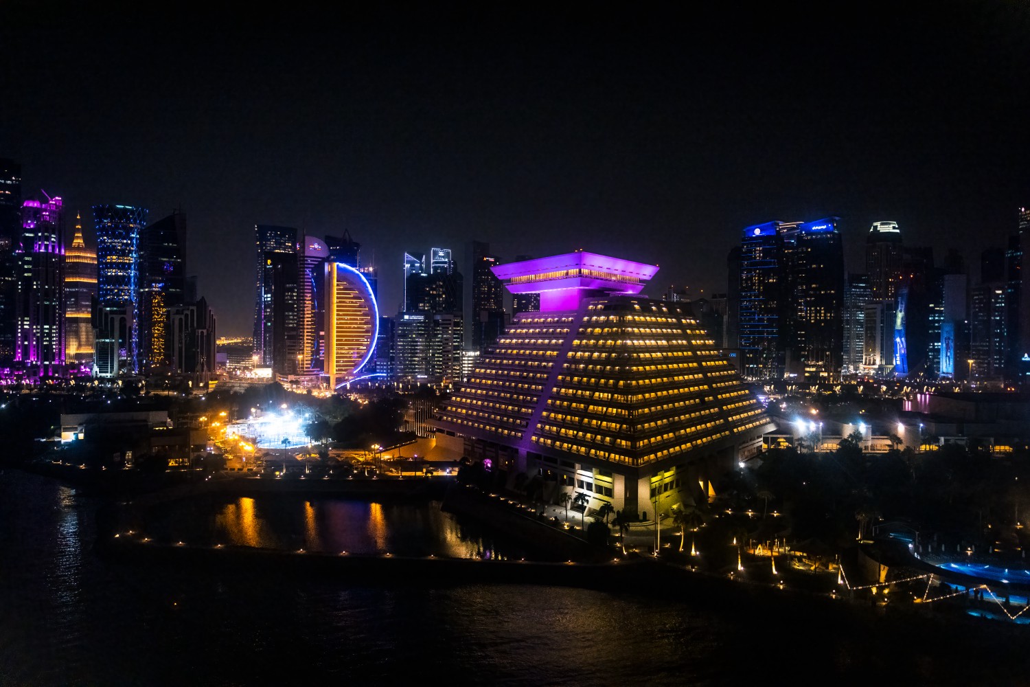 Inauguré en 1982, l’hôtel 5 étoiles Sheraton (au premier plan sur la photo) a introduit une nouvelle norme d’architecture moderne. Projet pionnier du plan de développement du district nord de Doha (NDOD) ou West Bay, l’hôtel de 16 étages est resté l’un des deux plus hauts bâtiments de la capitale jusque dans les années 1990. Premier hôtel international construit au Qatar, ses suites royales ont vu passer nombre de têtes couronnées et de présidents étrangers. Malgré une concurrence accrue, l’actuel hôtel Sheraton Grand Doha Resort & Convention conserve plusieurs atouts. Tout d’abord, sa localisation à l’extrémité nord de la Corniche le fait bénéficier d’une plage privée. Ensuite, son architecture pyramidale permet d’offrir à chacune des chambres une vue spectaculaire sur les gratte-ciels de West Bay ou sur le golfe Persique.