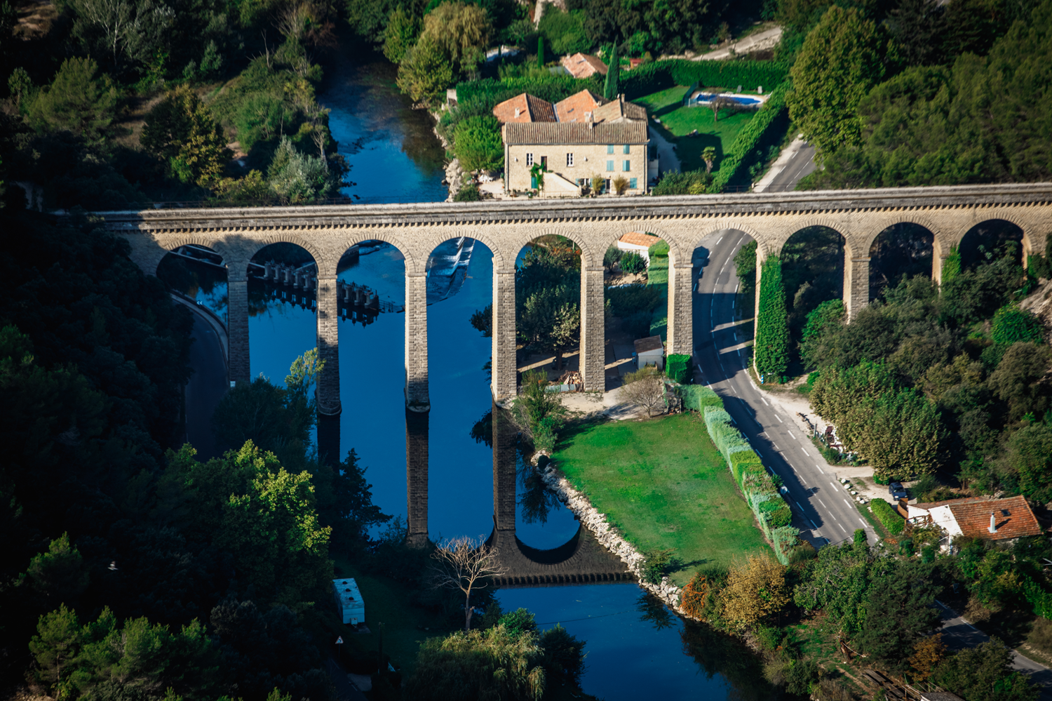 The Galas aqueduct bridge is implanted in the locality of La Beaume in the municipality of Fontaine-de-Vaucluse. It was designed by the Ponts et Chaussées engineers Conté, Perrier, Masselin and Gendarme and built between 1854 and 1857 above the Sorgue river. Five hundred and five ft (154 m) long and more than 78 ft (24 m) high, it is made up of thirteen semicircular arches with an opening of 29.5 ft (9 m).