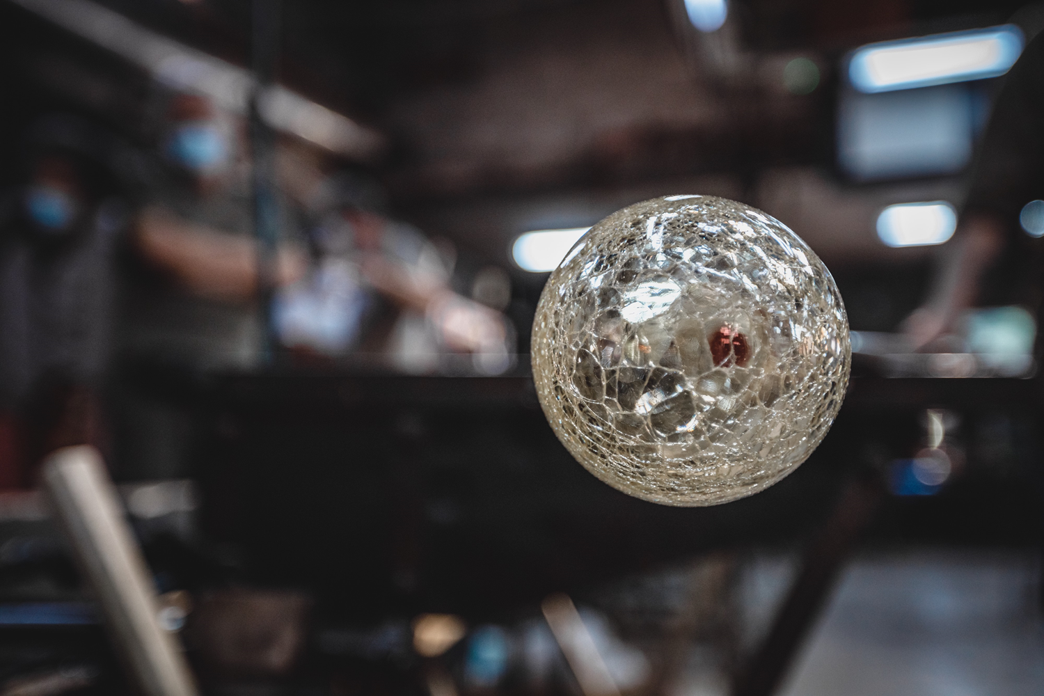 Glass crazing is a deliberate decorating technique that gives the final glass a cracked surface appearance similar to frost or frozen water well rendered by the English term ice-glass. To obtain this effect, the parison - the calibrated mass of molten glass intended to be shaped - of still soft glass must be immersed in cold water during blowing. This process creates a network of cracks that enlarges during the successive reheating and blowing operations.