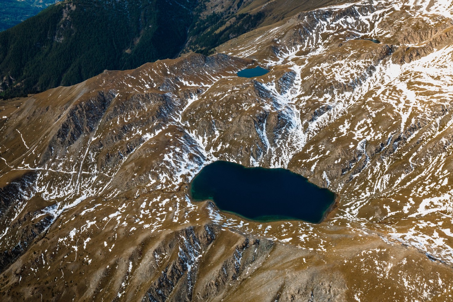 The Malrif lakes extend in the schistose Queyras in the east of the massif on the border with Italy. These lustrous shales making the soil waterproof and clogging it with water cause landslides and mud or grass slides clearly visible above Lake Mézan (photo). Both solifluction flows due to the impermeability of the subsoil and frost flows linked to thawing on the surface of the still frozen ground are visible there.