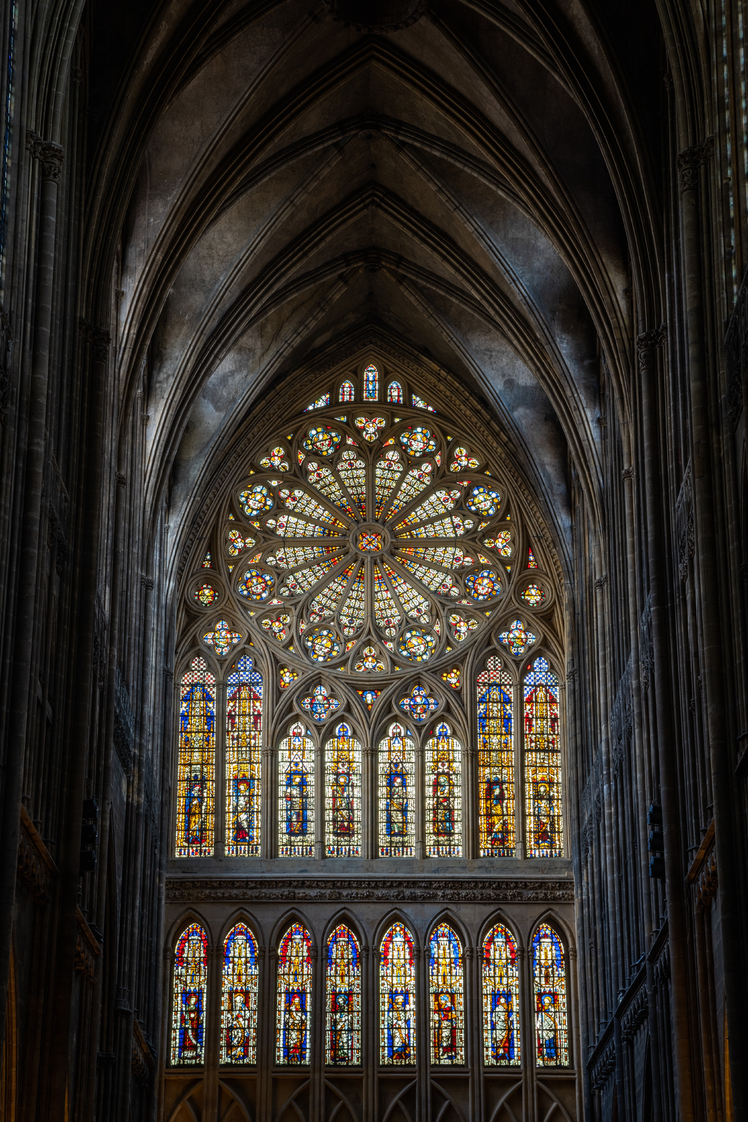 Two-thirds of the facade of Saint Stephen Cathedral are occupied by the rose window. Its multiple stained-glass windows once went down to the bottom of the wall, but the architect Jacques-François Blondel had them blocked in 1764. The rose's design consists of a solar and lunar halo symbolizing the world. It has massive dimensions with 91 ft in height (28 m) and 42 ft in width (13 m). Like all roses of rota style, its diameter is 36 ft (11 m). It was crafted by Hermann of Münster and completed in 1384.