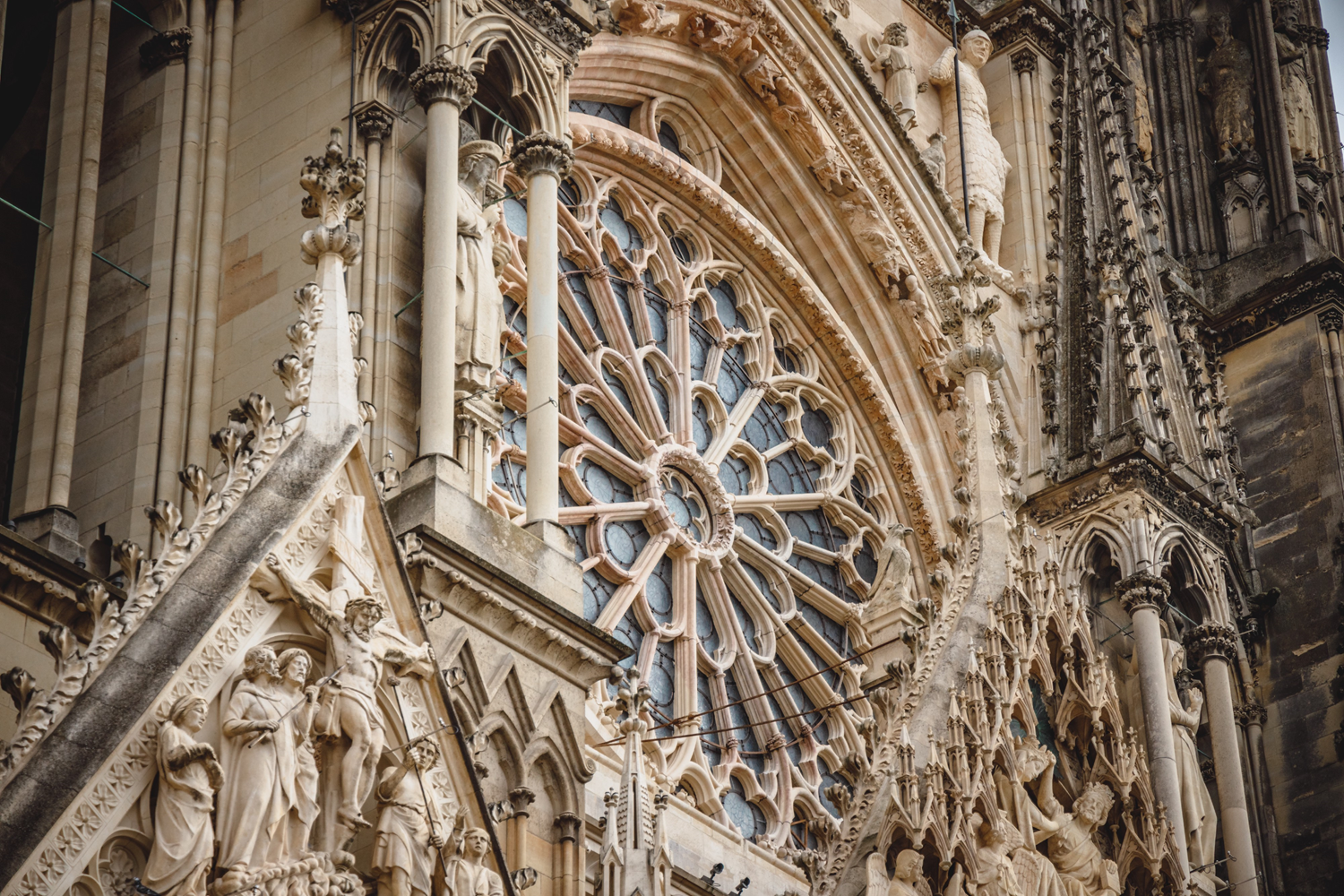 The large rose window of Reims Cathedral consists of a 39 ft wide (12 m) lace of stones. Similar to a divine eye bringing light inside the monument, it symbolizes eternity as it has no beginning or end. The rose window is composed of 12 parts referring to the 12 apostles and the 12 tribes of Israel. It stands surrounded by statues representing the pilgrims of Emmaus, witnesses of the resurrection of Christ.
