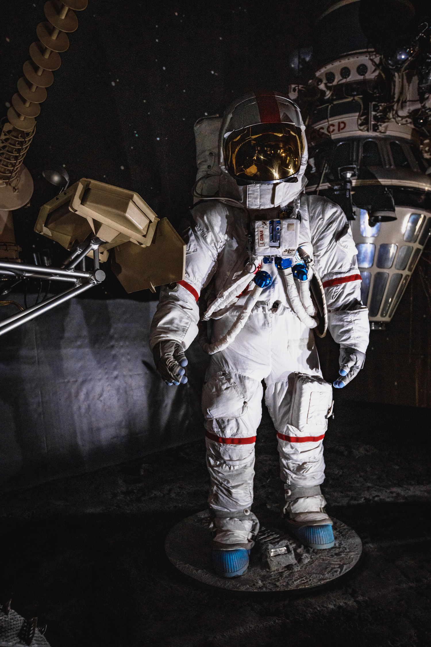 The Musée de l’Air et de l’Espace (Air and Space Museum) has a replica of the A7-LB spacesuit worn by Eugene Cernan, the commander of the Apollo 17 mission (7-19 December 1972), in the Space Exploration Hall. The suit was modified in the pelvis so that the astronauts could sit in the rover driven on the Moon. The red stripes on the sleeves were reserved for the Apollo mission commanders (from Apollo 13 onwards). Gene Cernan made three spacewalks lasting a total of 22 hours and 4 minutes and collected 110 kg of lunar rocks. He was the last man to set foot on the Moon.