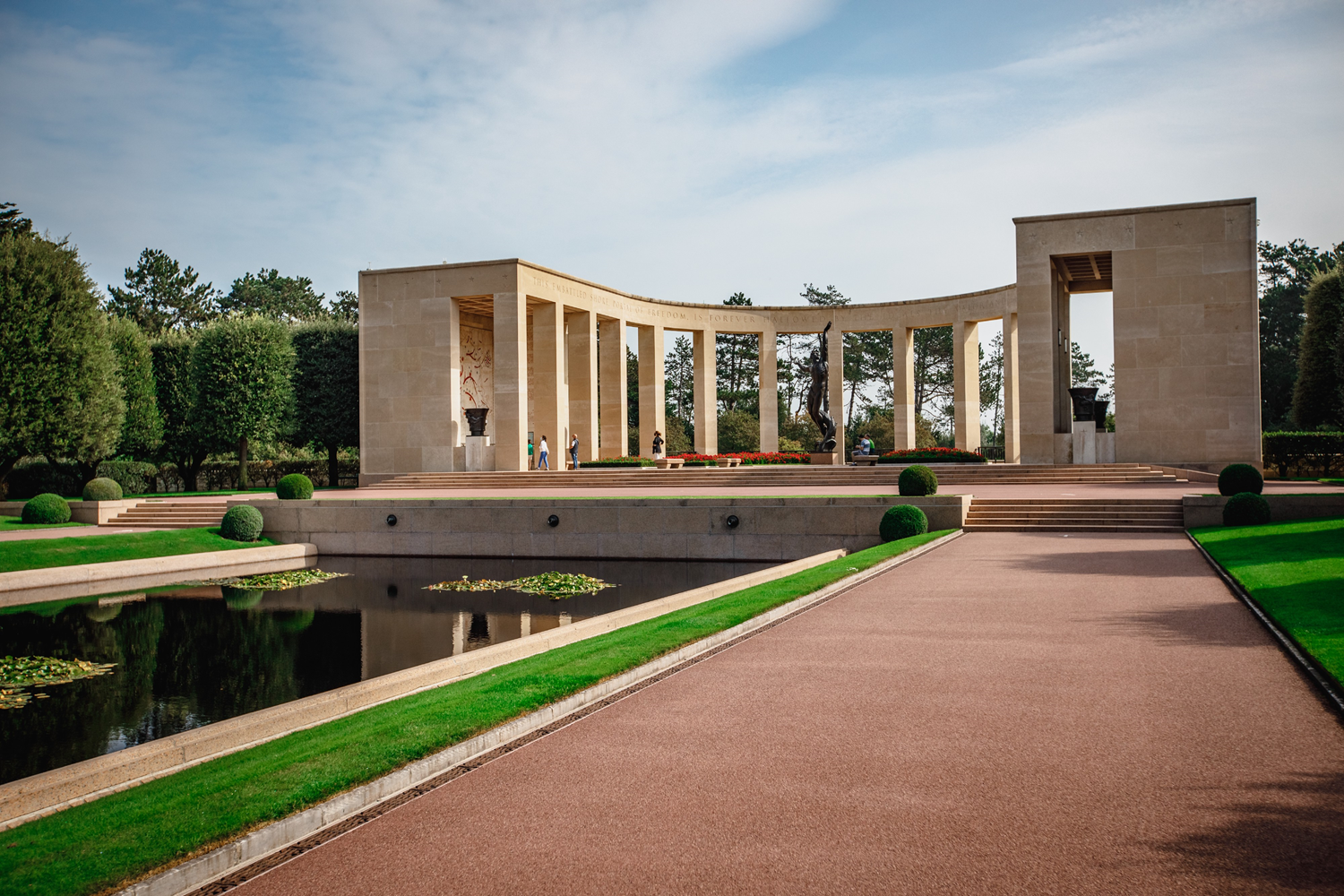 The Colleville-sur-Mer American Cemetery is situated at the top of the cliff overlooking Omaha Beach, one of the sites of the Normandy landings of 6 June 1944. Beyond the reception building, a semi-circular memorial can be seen with a 7-metre-high bronze statue symbolising the ‘Spirit of American Youth Rising from the Waves’ in its centre. Continuing from the pool, in which the columns of the Memorial are reflected, the central walkway serves 10 squares of graves where 9,387 soldiers lie, including 4 women and 307 unknowns. Below, Omaha Beach unfurls its quiet-again long ribbon of sand.